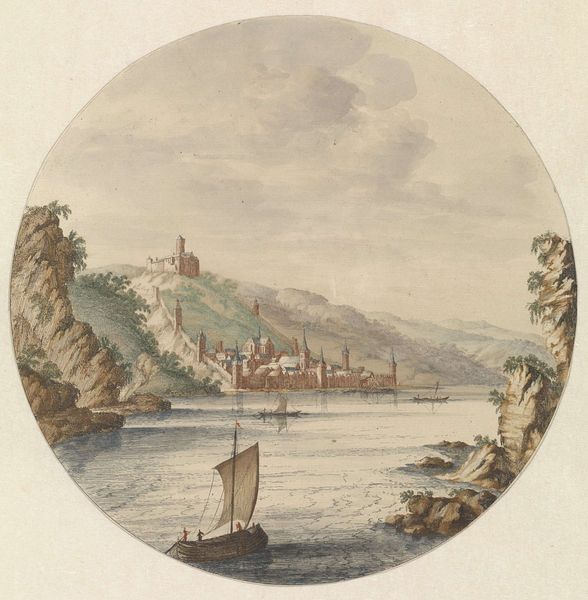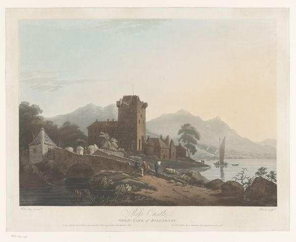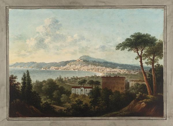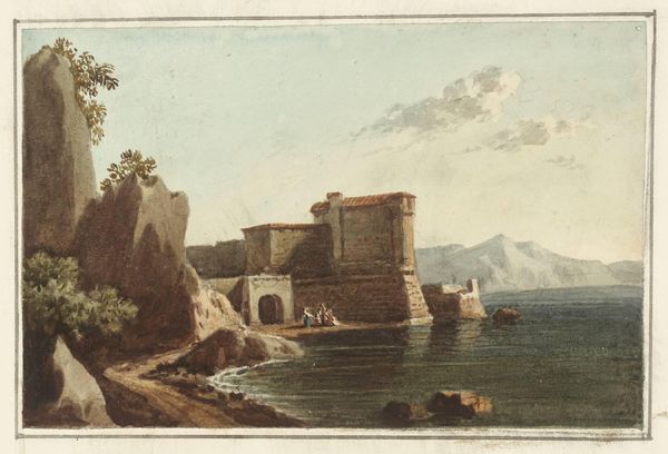 Editor: So, this is "4. From Pausilipo" by John 'Warwick' Smith. It's a watercolor piece, and something about the muted tones gives it such a serene, almost wistful feeling. What do you see in this piece? Curator: It’s like a faded memory, isn’t it? Smith really captures that 18th-century fascination with classical landscapes, but with a soft touch. It's not just a pretty view; you can almost smell the sea air and hear the faint echoes of history. The figures on the beach—are they simply admiring the scenery, or are they pondering the ruins, lost in thought, just like us? Editor: I hadn’t thought about them being lost in thought. It makes the piece even more poignant. Curator: Art has a sneaky way of mirroring our own inner landscapes, doesn't it? Editor: Absolutely! I'll definitely remember that. Thanks!