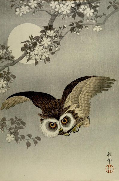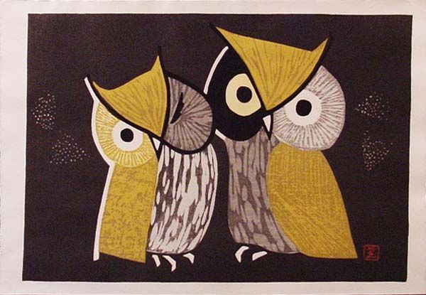 Toshi Yoshida's "Two Owls" presents a serene scene rendered with delicate lines and subtle gradations of color. The composition is anchored by a robust, horizontal tree branch, upon which the two owls are perched. The artist's use of line is particularly striking, creating intricate patterns of feathers that invite us to explore the surface in detail. Yoshida masterfully uses the texture of the woodblock to create subtle variations in tone and depth. This technique, reminiscent of traditional ukiyo-e, is interwoven with modern sensibilities to evoke a sense of stillness and contemplation. The owls, rendered with soft, muted colors, exhibit a sense of quiet watchfulness that is enhanced by the surrounding foliage. The work is not just a representation of nature; it is an exploration of form and composition, where the interplay of line, color, and texture creates an emotionally evocative experience. The overall effect suggests a dialogue between tradition and modernity, inviting us to consider the enduring power of nature.