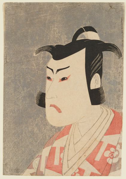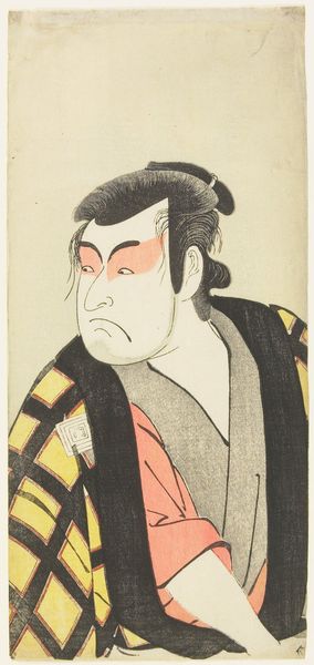 This woodblock print, "Wild Words – a Play," was created by Utagawa Kunisada. Observe the arresting gaze of the figure, rendered with stark lines that fix his expression in a moment of intense emotion. Kunisada uses bold patterns and colors to construct a visual field that oscillates between representation and abstraction. Note the patterned kimono, its intricate design flattened against the picture plane, which challenges traditional notions of depth and perspective. The composition, dominated by the figure’s upper body, draws us into the psychological space of the actor, whose crossed arms and clenched cloth suggest a narrative of constraint and internal conflict. Kunisada’s work embodies a sophisticated play with surface and form. It invites us to explore the complex interplay between the visual elements and cultural meanings embedded within the print’s graphic structure. This pushes the boundaries of representation and expression within the ukiyo-e tradition.