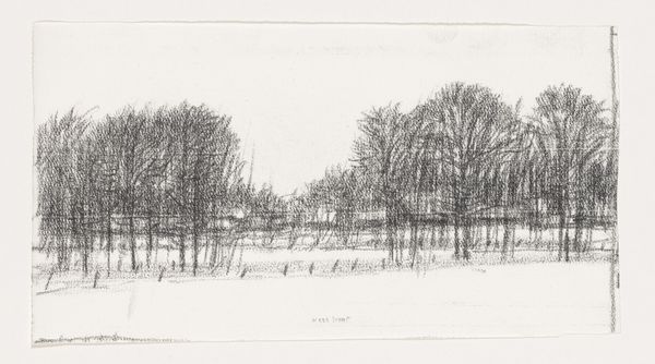 Editor: We're looking at Kees Stoop's "Bomenrij zonder blad," a charcoal and drawing from 1939 to 2009, now residing at the Rijksmuseum. It strikes me as quite stark, almost melancholic with the bare trees rendered in such detail. How do you interpret this work? Curator: Well, considering Stoop's lifetime spanned immense social and political upheaval, this landscape becomes charged. The starkness you noted can be read as a metaphor for loss, for the stripping away of not just leaves but also societal structures and certainties. Editor: So, the barrenness is a kind of social commentary? Curator: Potentially. The landscape genre has often been used to reflect a nation’s identity. But what happens when that identity is fractured or threatened? Do you notice the specific way the trees are drawn, almost skeletal? What could that signify? Editor: A fragility, perhaps? A reminder of the impermanence of things? I didn't initially see that commentary. Curator: Precisely. And given Stoop's working period, understanding the socio-political climate is essential. How does art both reflect and resist the dominant ideologies of its time? It raises fascinating questions. Editor: It’s making me think about how even seemingly simple landscape drawings can carry such complex, layered meanings relating to that era and how artists navigate times of political tension. Curator: Exactly. We must question whose narratives are centered, whose are erased. Every artistic decision has resonance, inviting us to challenge and reconsider the dominant order. Editor: I'll never look at a landscape the same way again! Thanks. Curator: Indeed! Art should always be a starting point for critical engagement.