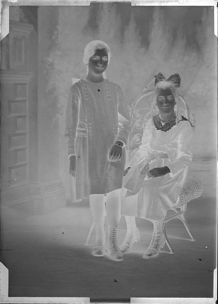 Editor: Here we see "Untitled (studio portrait, man and girl seated, formal clothes)" by Durette Studio. It's a silver gelatin print. The figures are ghostly because the image is a negative. What can you tell me about the context of this kind of photography? Curator: The Durette Studio operated within a specific economy of image production. The formal clothes, the studio backdrop, and the photographic process itself speak to a desire for social mobility and memorialization. How does the materiality of the photograph, the paper and silver, contribute to its meaning? Editor: So, it's not just about the people in the photo, but about the materials used to create the image. Curator: Precisely. Consider how the chemistry and labor involved in producing this image contribute to our understanding of its value and the social dynamics at play. Did the photo’s creation democratize or reinforce existing social hierarchies? Editor: That's a new way of thinking about photography for me. Thanks. Curator: Indeed, it’s important to consider the consumption of the portrait, too.
