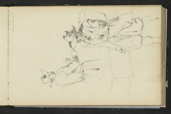 Editor: This is *Mannen in kostuums uit Zuid-Beveland* (Men in Costumes from Zuid-Beveland), a pencil drawing dating from around 1856-1861 by Cornelis Springer, housed here at the Rijksmuseum. The rough sketchiness gives the piece a sense of immediacy, almost like catching a fleeting moment. What catches your eye in terms of composition? Curator: The formal relationships within the work immediately strike me. Notice how Springer utilizes varied perspectives and orientations. One figure is presented frontally, another in profile, and a third seems almost diagrammatic. These diverse viewpoints disrupt any sense of conventional pictorial space, flattening the composition and highlighting the inherent qualities of the drawing medium itself. Editor: So, it's more about the *how* than the *what*? Curator: Precisely. The delicate hatching and cross-hatching create subtle gradations of tone, defining the forms and textures of the costumes. The repeated circular motifs—perhaps buttons or embellishments—create a rhythmic visual pattern, drawing the eye across the page. Consider also the negative space surrounding the figures; it is not merely void, but an active element, shaping our perception of the drawn forms. Editor: It’s interesting to consider the negative space as a deliberate choice, almost as important as the marks themselves. Curator: Indeed. The emphasis on line and form over realistic representation encourages a more conceptual engagement. We are invited to consider the formal properties of the drawing as an object in itself, rather than simply a window onto the world. This challenges traditional notions of realism, prompting reflection on the very nature of representation. Editor: I hadn't thought about it that way at all. Thank you for opening up a whole new perspective on how to approach this piece. Curator: My pleasure. Considering the interplay of form and medium allows us to see beyond the subject matter and appreciate the artist's deliberate choices in crafting a unique visual experience.