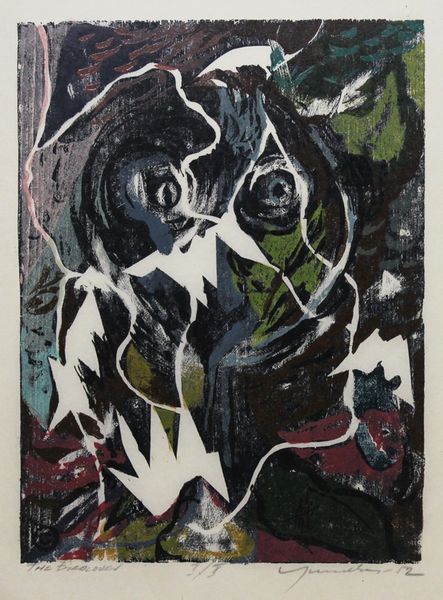 Curator: Chris Ofili's "Within Reach," created in 2003, employs mixed media in a fascinating exploration of figuration. What strikes you most at first glance? Editor: An intense vibrancy. The high-contrast, almost clashing, green and red are immediately striking. There's a lot of visual tension and it appears to almost vibrate before the eye. Curator: The patterned ground certainly creates a unique energy, and contrasts with the figures. Let’s consider how Ofili places figures in visual space. How might these color choices relate to the representation? Editor: Considering Ofili's heritage and the wider artistic context, I interpret this through the lens of the Black Arts Movement, specifically the use of color to reclaim cultural identity and challenge Western aesthetic norms. The figures, silhouetted, assert themselves against this background that suggests lush landscapes or vibrant cultural textiles. Curator: I see your point about cultural context, but the flattening of space interests me. Ofili creates a layered composition—the patterned leaves behind and the geometric structure framing the individuals, emphasizing surface design. Editor: And these patterns-- floral and geometric – are equally intriguing within the colonial discourse. Aren't we reminded of textiles produced both for and against an external gaze. How are the figures in relations to such designs? Curator: It appears the dress mirrors them...but as formal choices, one wonders the function of this aesthetic exchange! The rendering and color are far more simplified in areas to better foreground pattern play and shape-making throughout. Editor: I find this an image embedded in the complexities of postcolonial identity – it presents the negotiation of visibility and erasure of the individuals set amongst vibrant affirmations of cultural roots. It brings to question and resists simplistic narratives of representation. Curator: Ultimately, this piece provides fertile ground for discussions on cultural representation, the politics of identity, and above all else, visual dynamism as strategy. Editor: Exactly. It is an interesting engagement and invites each viewer to find their interpretation amongst its vibrant chaos.