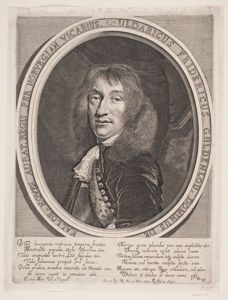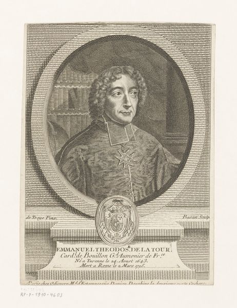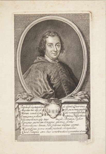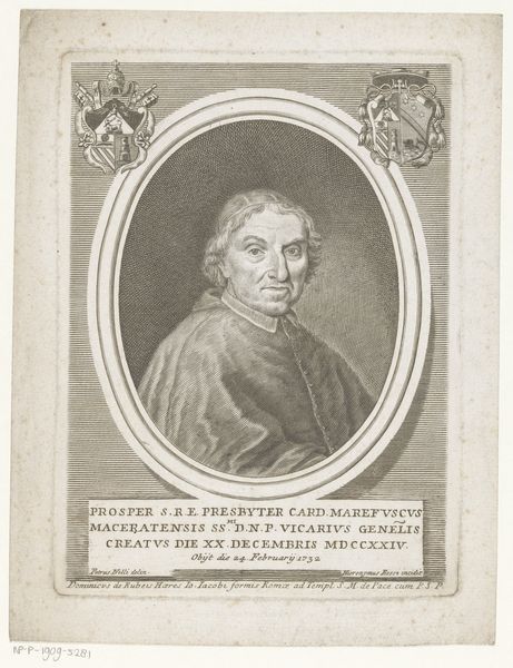 Girolamo Rossi created this print, Portrait of Cardinal Fabio Olivieri, in 1715. The composition presents us with an oval frame that neatly contains the Cardinal’s likeness, flanked by heraldic emblems. Rossi's technique, primarily line engraving, offers a rich yet restrained visual experience. The textures are rendered through meticulous line work, creating subtle shifts in tone and depth, particularly noticeable in the folds of the Cardinal's robes and the contours of his face. The oval frame not only isolates the subject but also serves as a stage, emphasizing the Cardinal’s presence and importance. The heraldic emblems add layers of meaning, acting as semiotic markers that reference the Cardinal's lineage and status within the Church. This image then functions as a cultural artifact, reflecting the intertwined dynamics of power, religion, and representation of the period.