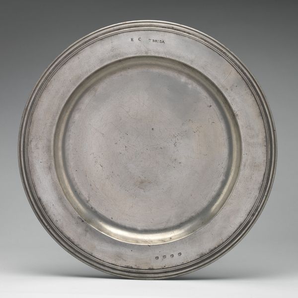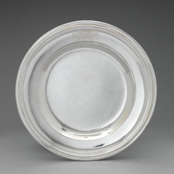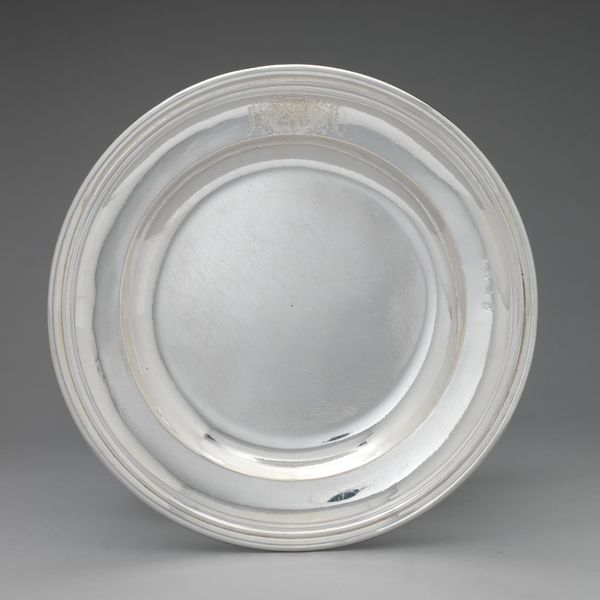 Curator: Well, isn’t it just gleaming? My first thought looking at it: lunar, like capturing the moon in metal. Editor: Indeed. What you're looking at is a silver dinner plate dating back to 1715. Part of a set of four, it’s an example of Baroque decorative art, now residing here at the Metropolitan Museum. Notice the understated elegance. Curator: Understated but definitely making a statement. Silver wasn’t exactly everyday tableware, right? I can already imagine the candlelight dancing across it. Editor: Precisely. It reflects the social hierarchies of the time. Objects like these signaled wealth, taste, and a connection to the English aristocracy, subtly embedded through the inclusion of their coat of arms, ever so discrete on the upper rim. Curator: Coats of arms! Oh, that’s so delicious. Almost like a secret handshake with the elite. Imagine the stories it could tell, if only it could speak. The dishes served, the conversations overheard. Was this purely display or everyday fine dining? Editor: Probably both. Remember, the act of dining itself was a performance. The presentation of food, the service, and the tableware—all contributing to the social theater. Displaying your wealth wasn't just about possessions; it was about power. Silver signified status. Curator: So, this unassuming plate is loaded with symbolism. Makes me wonder what they actually ate off of it, what epicurean delights landed on it, then vanished...almost a metaphor for fleeting power! Editor: (Chuckles) A very poetic point! Perhaps even intentionally ephemeral; food consumed and status maintained. As a relic it gives us a palpable sense of those long gone dinners and political exchanges happening over it. Curator: Thinking of history compressed into something so… functional. Amazing. Now, if only my microwave dish had the same narrative punch. Editor: Agreed, sometimes it's the everyday objects that provide the most profound insights. It makes you appreciate the depth in the things we often overlook.