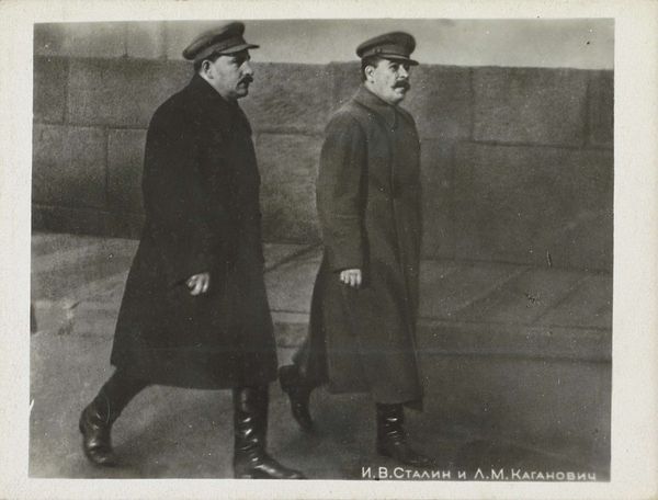 Curator: It strikes me immediately; this group seems steeped in the gravity of a significant moment. What are we looking at here? Editor: This is a gelatin-silver print from 1933 currently held in the Rijksmuseum’s collection. Its title is "KLM-bemanningsleden van de 'Pelikaan'", which translates to "KLM Crew Members of 'The Pelican.'" KLM, of course, being the Dutch Royal Airlines. It's a portrait of an airline crew—their seriousness practically palpable. Curator: Indeed. The emblems on their caps command a certain authority and invite us to unpack the layers of societal faith vested in aviation and these individuals. In those days especially, flying was relatively new—a risky enterprise to trust human lives to these professionals. What do you make of the fact they are nameless? Editor: Their anonymity resonates with broader shifts during this interwar period, where collectivity overshadowed the individual. It hints at a narrative around nascent technology and perhaps the subtle erasure of the individual to highlight this emerging corporate identity. We need to consider how labor movements shifted the dialogue from individual heroism to a collective enterprise. The symbolic power rests in what the KLM embodies and not in their separate identities. Curator: I agree. We must appreciate how, even without names, there's a quiet, stoic pride in their gaze. Note also that only the pilots wear uniforms; the rest wear civilian clothes, signaling that this select group holds special positions of honor and high expectation. This differentiation subtly evokes themes of responsibility, trust, and mastery of technology—almost shamanistic. Editor: Yes, and in those subtle costuming hierarchies are echoes of broader power dynamics – these visual distinctions emphasize societal structures and underscore the trust that the public placed in these burgeoning transportation industries and technologies of this new modernity. Considering how it relates to similar documentary photographs, this image embodies the hopes of the 1930s whilst still being a record of social relations in their era. Curator: So beautifully observed. This work reminds us of the symbolic depth that exists within simple photographs, allowing them to convey volumes about the attitudes of their era. Editor: Absolutely. Looking at the image through the lens of contemporary labor history illuminates not only advancements in technology but, more importantly, what those strides cost and who shouldered the burdens of those expectations.