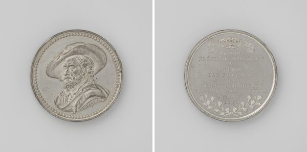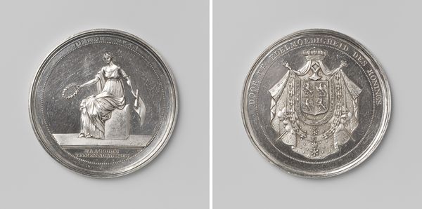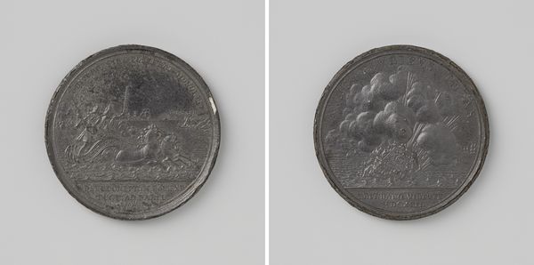 Curator: Here we have a medal from 1748 by Theodorus Everardus van Berckel titled "’s-Hertogenbosch, Vroedschapspenning op de Vrede van Aken"—roughly translated, it's a medal struck by the city council of 's-Hertogenbosch to commemorate the Peace of Aachen. What strikes you about it at first glance? Editor: The immediate impression is one of austere celebration. The monochromatic metallic relief and carefully arranged figures create a sense of controlled jubilation—it's dignified rather than overtly joyful. Curator: Indeed. Notice the allegorical figures and Latin inscriptions. On one side, we see a figure of Mars, the Roman god of war, extinguishing a torch, symbolizing the end of conflict, juxtaposed against a skyline of what seems to be the city itself. Editor: And opposite, a classical female figure, presumably Pax, goddess of Peace, holding what appears to be a cornucopia. The careful inscription, "MITESCVNT TEMPORA PACE," translates to "Times grow mild with peace." It really speaks to the intended audience, the city's elite, aligning their aspirations with classical ideals. Curator: The choice of Mars is particularly interesting, as he is not destroying but stopping—a very nuanced way to celebrate peace while still acknowledging the military efforts that led to it. We tend to view history through a grand lens, while often forgetting the symbols that served very local narratives and beliefs. Editor: Right. Consider that this wasn’t just a symbolic gesture—these medals, commissioned by the city council, became tangible tokens of political maneuvering, reinforcing the council's position within the community. This reinforces how cities sought stability after large, tumultuous conflicts such as The War of Austrian Sucession (1740-1748), as did many of the parties involved. Curator: A potent reminder that objects, even those seemingly small and commemorative, are active participants in the shaping of cultural memory. And each has meaning beyond its size, and that such symbols may differ slightly for varied social actors. Editor: Absolutely, prompting me to wonder, what specific aspects of the Peace did the local government seek to highlight? Were there factions pushing a particular narrative regarding their participation in the war and the resultant peace treaty? Curator: That’s the beauty of delving into these artefacts. They're far more than pretty objects—they're locked chests full of complex stories. Editor: Agreed. They invite us to keep digging, revealing layers upon layers of sociopolitical context beneath their elegant surfaces.