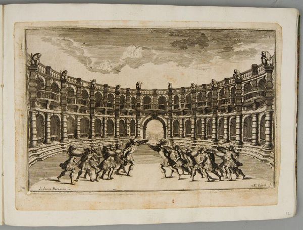 Editor: This is Matthäus Küsel's "Pallas' Temple in Athens," an etching. It's quite small, but creates such a grand, theatrical space. What strikes you about the image? Curator: Well, the etching process itself is central here. Think about the labor involved in creating these precise lines, the copper plate, the acid. How does this reproductive technology democratize or control access to images of power and classicism? Editor: That's fascinating. So, it's less about the temple itself and more about how the image was made and circulated? Curator: Precisely. Consider the marketplace this print entered. Who was consuming these images, and what did owning such a print signify about their social status and cultural aspirations? Editor: I see. It shifts the focus from the grand subject matter to the more grounded aspects of production and consumption. Thanks, that gives me a lot to think about.