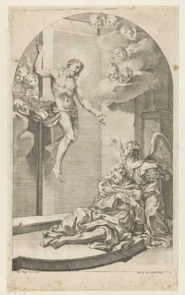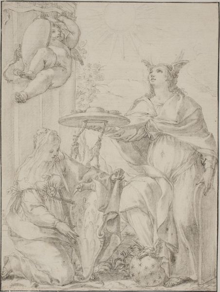 Editor: This engraving from the 1560s, "Three Muses and a Putto with Cymbals," is based on a design by Francesco Primaticcio and engraved by Giorgio Ghisi. I'm struck by how the rigid cross-shaped frame contains such fluid, fleshy forms. What catches your eye about this print? Curator: It's a fascinating intersection of artistic labour, isn't it? Ghisi is translating Primaticcio's vision into a repeatable, reproducible image. Consider the division of labor here – Primaticcio designs, Ghisi executes. The engraving medium itself allowed for wider dissemination and, therefore, consumption of these classical ideals, beyond the gilded walls of Fontainebleau. This expands the very *idea* of the original. Editor: So, it's less about individual artistic genius and more about the system of artistic production at the time? Curator: Precisely. Look at the deliberate tooling, the cross-hatching, the labour involved in replicating form and texture on the copper plate. Each line speaks to the market's desire for art, accessible not through commission but through purchase. Are we looking at "high art" or a sophisticated commodity, or perhaps both? Editor: That makes me think about the destruction of the Gallery of Ulysses; the print almost acts as a record of labor and a vehicle for consumption. It makes one ask, who exactly was the target audience? Curator: A keen question! A market steeped in Humanist ideals; the Italian Renaissance influencing courtly taste beyond the Alps. The print’s survival allows us to continue to discuss its role and materiality! Editor: I never thought about an artwork being a record of economic shifts. Thanks! Curator: Indeed, art isn’t solely about aesthetics, but speaks volumes about socio-economic networks as well!