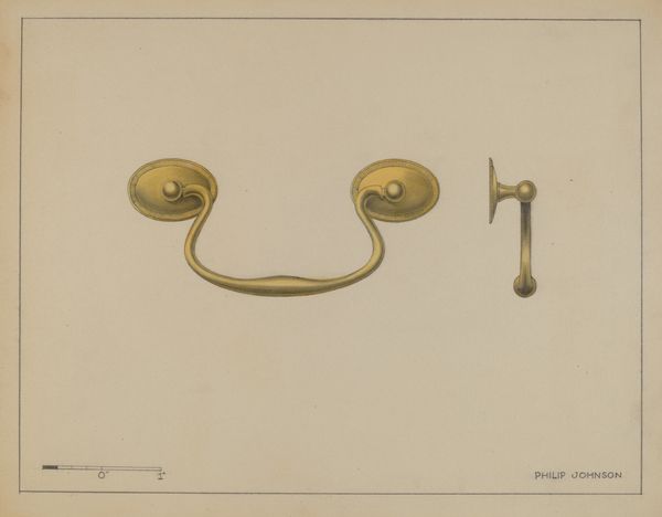 Editor: This watercolor piece, dating from around 1937, is titled "Wrought Iron Bit" by Gerald Transpota. I'm struck by the way the artist rendered the texture of the metal. It feels so tactile and real. What jumps out at you about this particular work? Curator: What's interesting to me is considering why an artist, in 1937, would choose to depict something as utilitarian as a horse bit. We must think about what was important at that historical moment. What symbols are loaded into an everyday object? This was still a time when the legacy of the American West loomed large in the national imagination. The cowboy and frontier life represented ideals of self-reliance and rugged individualism. Editor: So, it's less about the beauty of the object itself and more about what it represents in a larger cultural context? Curator: Exactly. Consider also the socio-economic situation: the Great Depression. Rural imagery, even a small element of it like this bit, offered a connection to a simpler, perhaps idealized, past. How do you think its function connects to social and political forces at that time? Editor: Well, a horse bit implies horsemanship, which implies labor, connection to the land... Maybe a quiet rejection of industrialization and urban life, a yearning for a return to simpler times during a period of great uncertainty. Curator: Precisely. So even in this unassuming still life, we find complex layers of cultural and historical meaning embedded in the public imagination. We should be considering also the artist's choice to render such a tool using watercolor and drawing, methods that require planning and labor of their own. It's all connected, wouldn't you say? Editor: Definitely. I hadn’t considered the deliberate choice to showcase those older skills as part of the larger statement. Now, it offers so much to unpack!