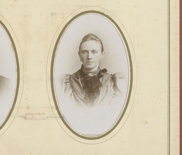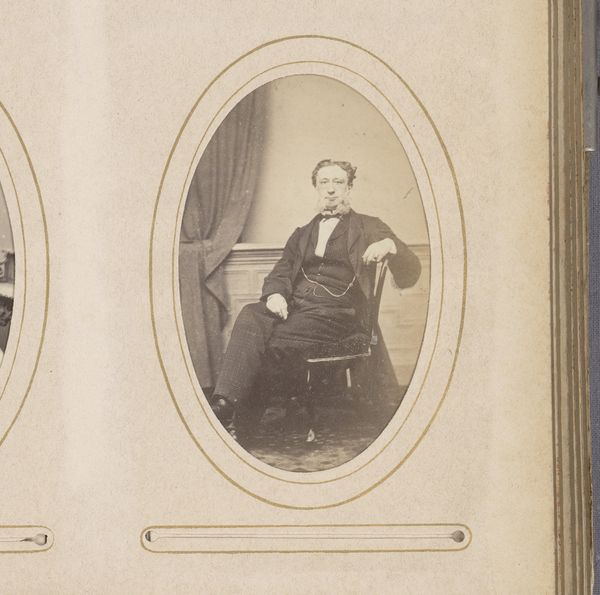 Curator: This photograph, entitled "Portret van een jongen op een stoel met een boek in de hand" by Jhn. Johs. Schröder, dates roughly from 1895 to 1920. It immediately strikes me with a sense of faded formality. Editor: Indeed. It’s a muted, almost solemn portrait. I notice first the oval frame around the image – a presentation style indicative of the era – immediately creating a sense of preciousness and perhaps the status of the subject. Curator: The production methods for these types of portraits were quite standardized. The subject would come to a photographer’s studio that were appearing in every big and middle size city at that time, they are typically positioned and lit for the photograph; a technician and artist has prepared every stage in production for a customer who wants to have an iconic photo with an iconic figure to display, indicating access and prosperity, the quality of image and paper matters and every part indicates production investments to gain status. Editor: And that presentation shaped not only the family album but, more broadly, social aspirations and values within bourgeois society, projecting this image of themselves. That the boy holds a book becomes central to constructing an idea around intellect, and that they are a reading and thus enlightened, family. I see some framed picture or books on the table beside him; so, there are already messages layered inside a photo inside a picture. Curator: Precisely. Notice the detailing on the chair and even the boy’s clothing, indicating that he is maybe part of the new growing class, they gain stability after the war of 1870. In production they use clothing, set pieces and other features of photography as a tool to signify social and cultural elevation. I also wonder what type of material and printing processes that Jhn. Johs. Schröder did use. Editor: This image and similar photographs became ways to shape public memory. Here the social values surrounding childhood and education take a form; to create family legacy – and these were readily consumed and valued by middle class society in particular, offering visual affirmations of their own successes. Curator: That's a valuable point. These were almost like early forms of public relations or marketing for families wanting to establish themselves. Seeing this image makes you think about all involved in the production line and logistics to put families on display, for good. Editor: Exactly. Looking closer helps reveal the story embedded in its creation and its function to promote family belonging to broader ideals.