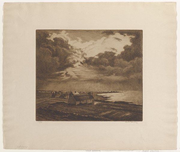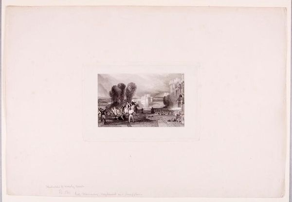 Editor: Here we have J.M.W. Turner's "Ploughing, Eton," housed here at the Harvard Art Museums. It's rendered in warm sepia tones. The figures seem embedded in the landscape. What strikes you about the visual composition of this piece? Curator: The tonality creates a unified field, almost obscuring the figures. Consider how the artist manipulates light and shadow to define form. Notice the etched lines, their density and direction. How do they contribute to the illusion of depth and texture? Editor: I see that now, how the density of the lines creates the darker areas! Curator: Indeed. The interplay between the foreground and the background, mediated by these techniques, presents a compelling formal study. Editor: It's amazing how much you can see when you break it down like that! I'll never look at a Turner the same way. Curator: Precisely. Understanding the formal elements allows for a richer appreciation.