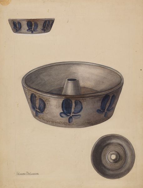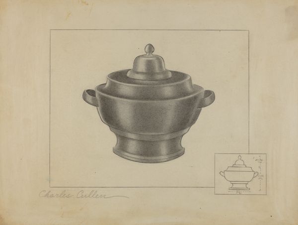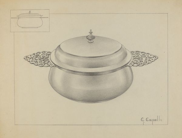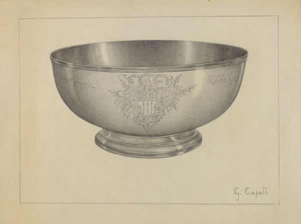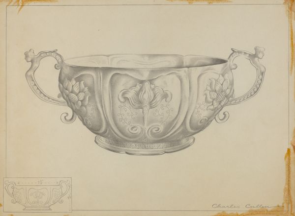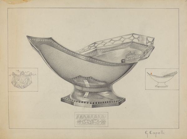 Curator: This is Edgar L. Pearce's "Silver Monteith Bowl," a pencil drawing created sometime between 1935 and 1942. The bowl itself, perched delicately on a footed base, is the focus, with detailed sketches surrounding it. Editor: There's a lovely restraint to the line work; a muted grandeur, if you will. What strikes me most is the inherent labor suggested, every stroke deliberate, in a manner as crafted and intentional as silver work itself. Curator: Absolutely. And I see something poetic here: the sketch mirrors the function of a monteith bowl itself—a preparatory drawing, a holder of future potential, mirroring the bowl that would, in its day, cradle cooling glasses. Editor: That layering of use—it also mirrors an age of meticulous making and social refinement. You see evidence of skilled craftsmanship and consumption, perhaps gesturing toward leisure. Where do you see this drawing fitting into the broader arc of material studies? Curator: Its place as a potential blueprint grants this pencil drawing an unusual life of its own, it becomes an aesthetic object separate from, while still in service to, the imagined bowl. Like a musical score independent of any performance. Editor: A fascinating tension. Pearce meticulously renders the form, but leaves its cultural significance floating. It challenges what craft entails, both practically and symbolically—reminding us of labor, material, and also how everyday items accumulate a specific weight and social currency. The almost academic composition highlights how even luxury items are anchored to functional necessity. Curator: Well said! To look at the bowl is also to look at the maker and the user—and how drawing acts as this incredible vessel itself, pregnant with potential narratives. Editor: I appreciate how the artist is capturing not only the item but its cultural significance, prompting us to examine the layers of value.