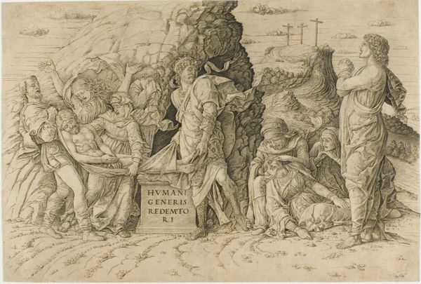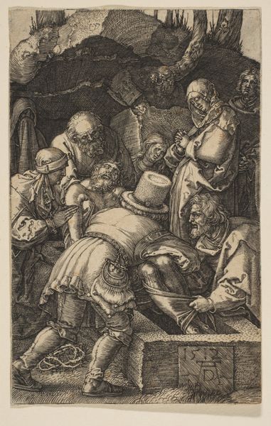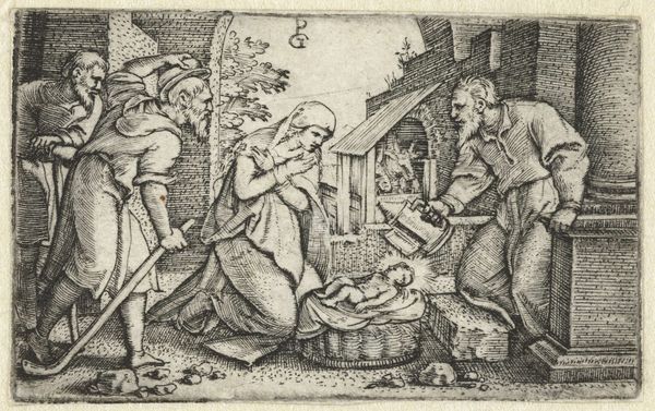 Editor: Here we have Georg Pencz's "The Persecution of Job," an engraving dating back to the first half of the 16th century. There's such bleakness in this scene. What strikes you when you look at it? Curator: You know, it’s funny, that's my first thought too - utter bleakness, yet within it, I see a flicker of profound humanity, twisted as it is. Pencz really captures that Northern Renaissance obsession with mortality, doesn't he? The stark lines, the emaciated figure of Job... it all screams "life is suffering." I wonder if Pencz was going through a rough patch himself at the time... Or maybe everyone in Nuremberg was! How much was bubonic plague at play here, influencing artistic sensibilities, I wonder... Tell me, what kind of narrative resonances does this small scene hold for you? Editor: I guess it's the universality of suffering that resonates. Even though it’s a biblical story, it feels… timeless. Job loses everything, his family, his health… It’s brutal. It's the human drama played out. But I struggle a bit with the background. Is that his house burning? Curator: Oh, yes, the details! It is indeed his house aflame - notice how calmly the woman strides toward Job, as if nothing can truly wound him further. But did you clock the weird bird-like figure looming near Job? A demon of sorts, perhaps? Or is it some odd Renaissance medical figure or some harbinger? That thing unsettles me the most, I confess, the lack of answers around it. So then, where does that uncertainty take us in our assessment of the image? Editor: Hmmm... Perhaps it highlights how suffering can be incomprehensible, that there is a monstrous or unexplained quality to tragedy. This was really helpful to understand. Curator: Agreed, this makes a difference. Ultimately the question is whether or not one accepts all the unknowns, and the extent to which we each have a choice in doing so. What a marvel that Georg Pencz has delivered so much existential material within such a tight frame.