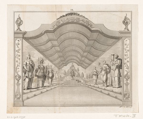 Curator: Ah, this print, "Schouwburg met toneeldecor: De Berg van Parnas," possibly created between 1738 and 1765 by Jan Punt. It's currently held at the Rijksmuseum, and the engraving captures a theatrical scene. Editor: It's remarkably stiff. Almost oppressively formal. But then I realize—it's *meant* to be stiff, it’s theatre. Still, all those powdered wigs! Curator: Absolutely. The artwork is particularly compelling when you consider how theatre served as a site for social and political critique, especially within the context of burgeoning Enlightenment ideals. Theatre was an interesting location, frequently staging veiled critiques of power and privilege. This piece offers a window into that world, quite literally! Editor: So you're saying all the prim and powdered figures are potentially part of an elaborate performance of social critique, hidden in plain sight? Curator: Precisely. Look at the way perspective is used; the eye is drawn deep into the scene, almost forcing one to penetrate beyond the surface, to see what lurks behind. In terms of symbolism, think about the staging, itself! What statement is made? Editor: The idea of 'Parnassus' – this mountain of artistic and intellectual enlightenment - presented on a literal stage is a fascinating thing. Almost as if Jan Punt wanted us to look at not only the performance but, in the words of French sociologist, Pierre Bourdieu, the ‘cultural capital’ which enabled such spectacle. I suppose what seems ‘stiff’ and inaccessible may instead be about exclusion as part of the aesthetic experience. Who gets access to the arts? Who doesn’t? Curator: Such a thoughtful and vital question. It transforms the whole composition. Looking closely at the details within, you can see the rigid posture of individuals reflecting the limitations of the time... even the rigid constraints put on the imagination. Editor: Perhaps the brilliance of art like this lies in its invitation to both acknowledge historical realities, while also considering questions of artistic purpose: for whom? By whom? Curator: Indeed. We are constantly asking "Who's on stage, and who's in the audience?" Editor: Absolutely! I am reminded of some lines from feminist theorist, Gayatri Spivak... “the subaltern cannot speak,” and here perhaps, it’s worth trying to tune one's ear a little closer to hear whom art actually serves, even now.