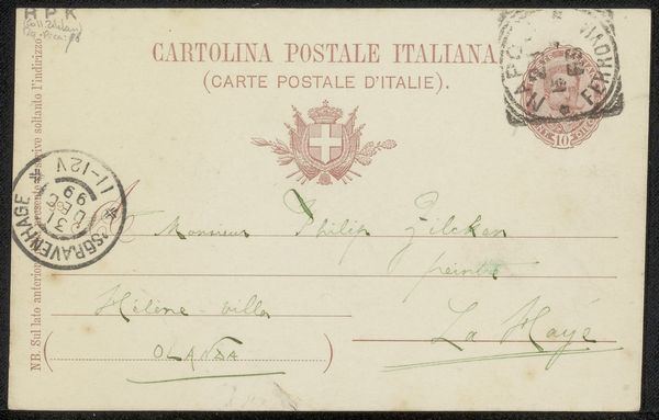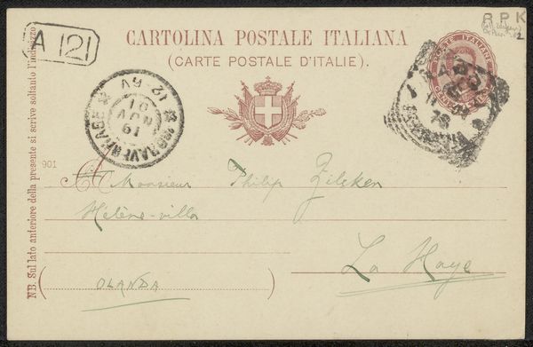 This is a briefkaart, a postcard, sent to Philip Zilcken by Vittorio Pica. It is machine printed on thin card stock, a format developed in the 19th century as a cheap, efficient way to send messages. The card’s material and production are part of a wider history of industrialization and mass communication. The printed design, postage stamp, and postmark, all elements of the card, were enabled by advances in printing, postal services, and transportation. The handwriting in red ink marks the card as more personal, with the message a direct expression, made by the sender. The postcard is a material embodiment of a moment in time and place, capturing a snippet of social interaction and artistic exchange between two individuals within a network of artistic exchange. In considering the postcard's significance, we should recognize that its value extends beyond its function as a mere message carrier, and is an artifact deeply embedded in social, technological, and cultural contexts.