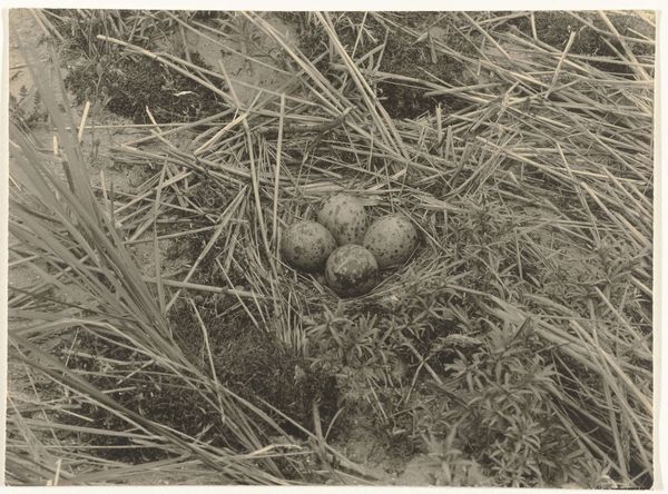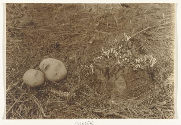 Curator: Richard Tepe’s photograph, “Gele knolzwam,” captured sometime between 1900 and 1930, presents a fascinating study in natural form. Editor: It's oddly… unsettling. The subdued tonality, the sharp, almost crystalline forms of the fungi juxtaposed against the softness of the surrounding flora. It evokes a slightly alien landscape. Curator: The composition directs the eye. Note how the varying textures of the leaves and blades of grass converge toward the focal point: the fungi themselves. The shallow depth of field emphasizes this visual hierarchy. Editor: And the fungi themselves—what do they symbolize? They strike me as emblems of hidden forces within nature: decay, regeneration, the unseen life beneath the surface. It's all caught in this amber tone that feels timeless and vaguely unsettling. Curator: Indeed, there's a palpable tension between representation and abstraction. While clearly depicting these organic forms, the tonal range, the focus, and the perspective push the photograph beyond simple mimesis. Tepe presents, above all else, an orchestration of tonal values and textural contrasts. Editor: Perhaps that’s it; it calls to mind similar early photography capturing microscopic specimens or even anatomical displays. It seems intent to portray that moment we see the natural world both beautifully familiar, and profoundly, disturbingly other. The light catches just right and suddenly there’s more complexity than we thought possible. Curator: Well put! It is a convergence between meticulous observation and, as you noted, symbolic representation. The formal tension invites deeper contemplation of natural systems. Editor: It invites wonder, for sure. Curator: For me, the beauty of its carefully balanced elements, renders this work, endlessly stimulating.