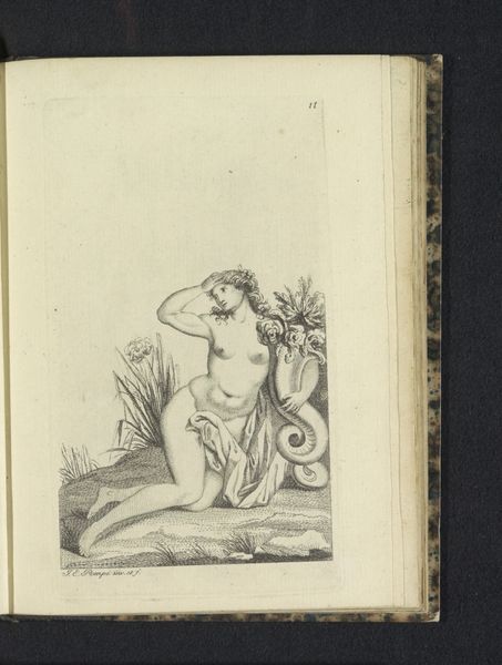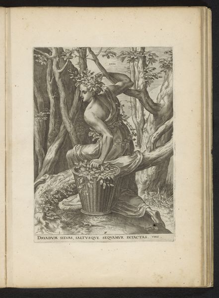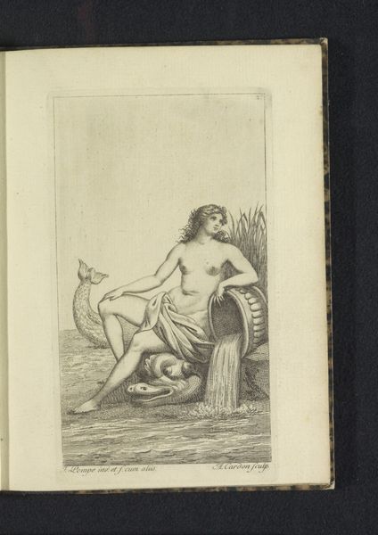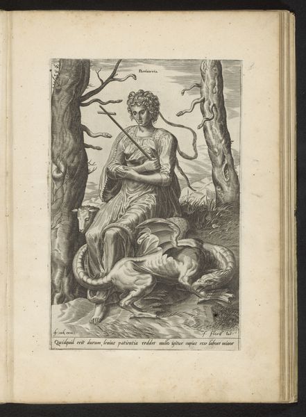 Editor: Here we have "Volharding," an engraving from 1560 by Cornelis Cort, housed at the Rijksmuseum. I’m struck by the figure's stillness amidst this watery, wild setting. What do you see in this piece? Curator: I see a fascinating interplay of symbols meant to be deciphered. Consider the woman herself: do you notice the inscription "PERSEVERANTIA" above her head? This engraving, ripe with allegorical intent, embodies steadfastness, persistence in the face of mutability. Editor: Yes, now that you mention it, the inscription is rather prominent. So the fish, the marsh – they're not just part of the background? Curator: Absolutely not! The reeds suggest an environment of challenges and obstructions. And what about the seal beneath her, or the woman herself tightly embracing the fish? Don't you think the artist purposefully paired such unlikely and clashing images? Editor: They do seem juxtaposed. Is the implication that persistence is about controlling primal instincts, like the seal, and harnessing slippery opportunities, like the fish? Curator: Precisely! She tames the inconstant elements of water represented by the seal, and controls Fortuna, depicted by the fish she clutches tightly. And observe that single bird flying towards what may be dawn, the woman's head oriented in the opposite direction! A beautiful and striking depiction of hope in continued, directed perseverance. Editor: That’s fascinating. I never would have picked up on the nuances of those symbols on my own. Curator: Visual language is full of such memory encoded as imagery. This is why artworks like these become powerful artifacts of knowledge for us!