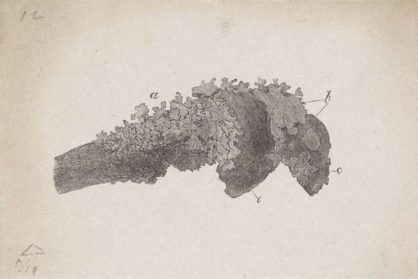 Editor: This pencil drawing, "Menselijk bot met een afwijking" - that's "Human bone with an anomaly" - by Isaac Weissenbruch, probably made between 1836 and 1912, is remarkably detailed and well, a little unsettling. It is what it claims to be - a human bone, heavily scarred. What do you make of this clinical, yet deeply human, study? Curator: The drawing itself speaks to a specific moment when art and science were deeply intertwined. But even then, there's a sense of more than just clinical study. Weissenbruch uses line and shadow to evoke a sense of the bone's history, its past trauma. Notice the lettering. What does that call to mind for you? Editor: It makes me think of medical diagrams, perhaps for teaching or documentation. Curator: Precisely. It situates the work in the realm of scientific inquiry, but consider how Weissenbruch renders the texture of the bone. It is incredibly tactile, almost visceral, evoking the experience of disease. Is this bone, for example, symbolic? Does it reflect contemporary attitudes towards health, death, or even social deviancy? Editor: That's fascinating; I hadn't considered that the visual texture might carry such heavy cultural baggage! Curator: Consider also the implications of focusing on something 'abnormal.' Deviations from the perceived 'norm' often carry significant cultural weight. How might this image be perceived in a time of great medical uncertainty, like a plague, for example? This goes beyond science, speaking directly to fears and anxieties tied to the human body. Editor: So, it becomes a mirror reflecting societal concerns. I’ll definitely think about how the context informs the emotional impact going forward. Curator: Indeed. Visual symbols hold such power in collective memory. And I now better understand the scientific use of art in the 19th century!