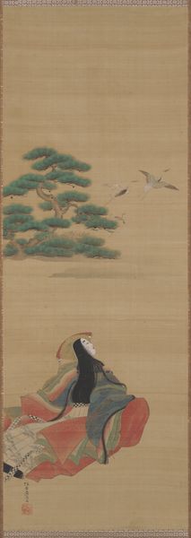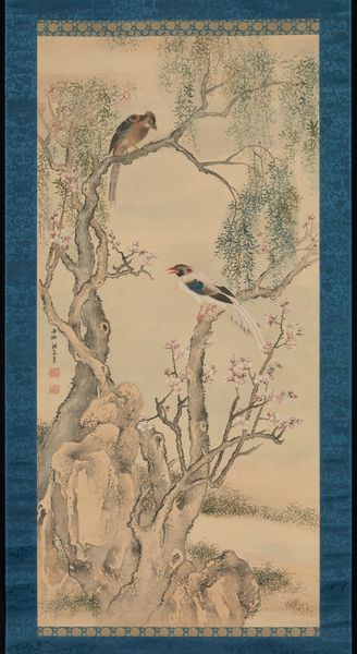 Curator: Looking at this silk scroll by Sō Shiseki, created sometime between 1715 and 1786, the elegance of the Edo period truly sings! Editor: It has a subdued charm, doesn't it? The birds perched amongst the blossoming branches exude tranquility. It's instantly calming. Curator: Indeed. Shiseki was a master of the nanga style, drawing heavily on Chinese literati painting traditions but making it entirely his own. Editor: You can see that Chinese influence, especially in the delicate brushwork and the emphasis on capturing the spirit, or qi, of the natural world. It's fascinating how he’s handled the watercolor medium, the subtleties in tone are incredible. Curator: Shiseki diverged from pure imitation, opting to explore European painting techniques learned from illustrated books which lent a touch of realism to his work, blending the Eastern and Western traditions into this lovely harmony. Editor: That blend gives it such unique visual textures. The bird, in particular, almost has this photographic clarity alongside the gentle blurring in the flower petals. And the composition—the strategic placement of elements on the scroll—guides the viewer's eye with such precision. Curator: It’s a showcase of yamato-e sensibilities, too, rooted in native Japanese aesthetics with refined, decorative approaches. Each brushstroke carries meaning, a dance between tradition and innovation. The intention to portray not just what is seen, but what is felt. Editor: Exactly! This painting feels intimate. You’re not simply observing nature, you're invited into a private moment, into Shiseki's contemplation. You feel connected, in harmony with the life portrayed, a testament to the ability of art to bridge temporal gaps and reveal the emotional heart of things. Curator: Beautifully put, a serene escape crafted with extraordinary skill.