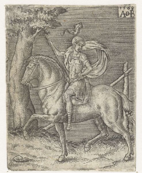 Editor: Here we have Barthel Beham’s "Hellebaardier te paard", created sometime between 1512 and 1540. It's a print, an engraving… I find the details incredible, especially considering the scale. It gives me a sense of contained power, like a coiled spring. How do you interpret this work? Curator: The engraving depicts a halberdier, a soldier equipped with a combined spear and axe weapon, on horseback, set against a detailed landscape. What's striking to me is the conscious display of status. Notice how the halberd itself isn’t just a weapon. It functions almost like a scepter, doesn't it? A symbol of authority and a direct link to earlier iconographic traditions. Editor: So you see a connection between the weapon and royal symbols? Curator: Absolutely. The halberd projects power. Beyond the man, though, consider the horse. Its sturdy build, almost docile posture. Is this a warhorse or a parade horse? And what does *that* choice tell us about the image's function? Editor: I hadn't thought of it that way. I was more focused on the human figure. It makes me consider the whole image is perhaps less about combat and more about… projecting strength. Curator: Exactly! These symbols – the halberd, the horse, even the dense foliage – collectively create a portrait of power, stability and earthly control, tapping into cultural memories of heroism and order. It’s fascinating how seemingly simple images can carry such weight. Editor: I see it now, how Beham is deliberately using these symbols. Thanks for shedding some light on this artwork! Curator: My pleasure! It's rewarding to trace how cultural values are encoded and transmitted through art across generations.