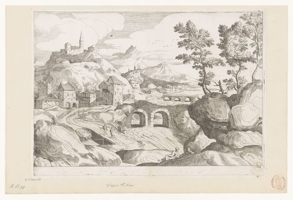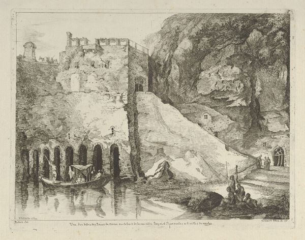 Editor: This etching, "Stadspoort bij een Italiaanse haven" by Jan Vincentsz. van der Vinne, created in 1686, depicts a city gate by an Italian harbor. The scene feels almost dreamlike, the detailed lines creating a hazy, almost melancholic atmosphere. What stands out to you in this piece? Curator: The etching's enduring quality stems from its embrace of certain symbolic tropes related to idealized memory and journey. Look at the gate itself, not just as an architectural feature, but as a symbol of transition, a threshold between known and unknown. The crumbling nature hints at the passage of time, layering history upon the scene. Do you notice how the figures are placed within the landscape? Editor: I see them! They are pretty small, almost like afterthoughts. Curator: Exactly. Their scale relative to the architecture reinforces a sense of human insignificance against the grand sweep of history. It evokes a particular response--a shared consciousness. Even the light serves the cultural memory aspect here. Note the contrasts, where some elements, like the figures clustered near the base of the archway, occupy darker, shadowy spaces, creating pockets of narrative, prompting the viewer to engage more closely. Editor: So, you're saying even the little details, like where the light falls and who is in it, all work together to create this mood? Curator: Precisely! Each element is a conscious choice that draws from a rich, visual vocabulary to transport the viewer. We see beyond a simple depiction of a harbor; we witness an artistic reflection of longing and place. Editor: That is more than meets the eye, I see it now. Thank you for helping to unpack the multiple meanings of the artwork, it gives me a better grasp of Baroque landscape as well.