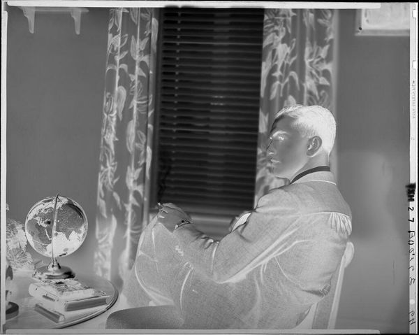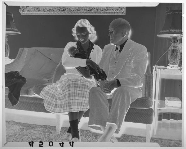 Editor: This untitled photograph by Lucian and Mary Brown captures a man, woman, and girl with a telephone, printed at just 4x5 inches. It’s so intriguing, almost dreamlike. What do you see in this piece? Curator: The telephone, first and foremost, acts as a powerful symbol. It represents connection and communication, but also absence. The girl’s interaction could symbolize the anxieties of a rapidly changing world, where technology mediates even familial bonds. Note the umbrella light, it has the shape of a halo, and how the negative image gives a ghostly feel. Editor: So, it's not just a snapshot of a family, but a commentary on communication itself? Curator: Precisely. The inverted tones invite us to reconsider what is present and what is hidden in our interactions. There is an almost voyeuristic feel, but that is due to the medium. Editor: I never thought about it that way! I will consider that more when looking at photos. Curator: It’s important to remember how much a single image can convey, even beyond its immediate subject.