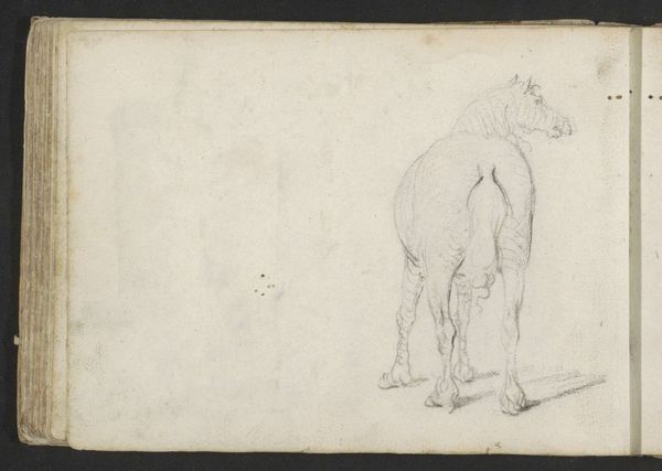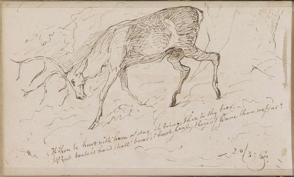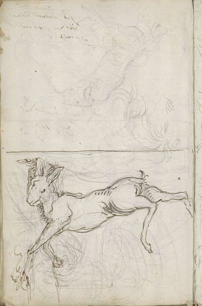 Curator: Here we have "Steigerend paard, een paardenkop en een mannenkop"—"Rearing Horse, a Horse's Head and a Man's Head"—by Johannes Tavenraat. The Rijksmuseum dates this ink and pen drawing on paper to between 1864 and 1880. Editor: It strikes me immediately as a study, almost a sketchbook page. The rough texture of the paper contrasts with the delicacy of the ink lines. There's an intimacy in its incompleteness. Curator: Precisely. The composition is spatially dynamic. The horse's head in the upper right—the primary subject—is rendered with quick, assured lines that convey an incredible sense of pent-up energy, a "Steigerend," rearing tension. Semiotically, the horse itself is, of course, a traditional symbol of power, freedom. Editor: Absolutely. Looking at the process, I’m drawn to how the artist seems to be experimenting. He’s using the ink to its full potential—those deliberate blots and spatters add texture and depth where they could have remained flat. What does this technique suggest about his studio practice? Was he refining a particular form, perhaps for a larger painting? Curator: One could certainly hypothesize along those lines. Structurally, the arrangement leads the eye diagonally from the lower left—the solid, shaded profile of a man—up towards the more ethereal outlines of the other heads. The human figure almost grounds the animal dynamism, providing a moment of stable observation. Editor: The material handling adds to the drama, actually. You see the bleed of the ink into the paper fibers. That kind of direct engagement between the medium and the support—paper was far from universally accessible then; there were certainly choices about quality involved, impacting production. The artist seems keenly aware of that interaction and uses it intentionally. Curator: Indeed, the limitations of the material are cleverly utilized to create the effect of movement. And this notion is central: he takes something static—a drawing—and makes it express unbridled motion through the careful use of line and form. Editor: Overall, considering the physical qualities, I think we see more than just preliminary work here. The artist’s clear manipulation of the materiality indicates conscious artistry in itself, not merely a preparatory sketch. It feels complete. Curator: Yes, I agree. Seeing these rough portraits reminds us of the depth to be found in what might first appear unfinished. Editor: And how understanding the materiality deepens our respect for both artistic labor and intentionality.