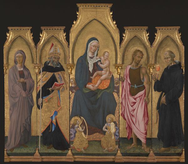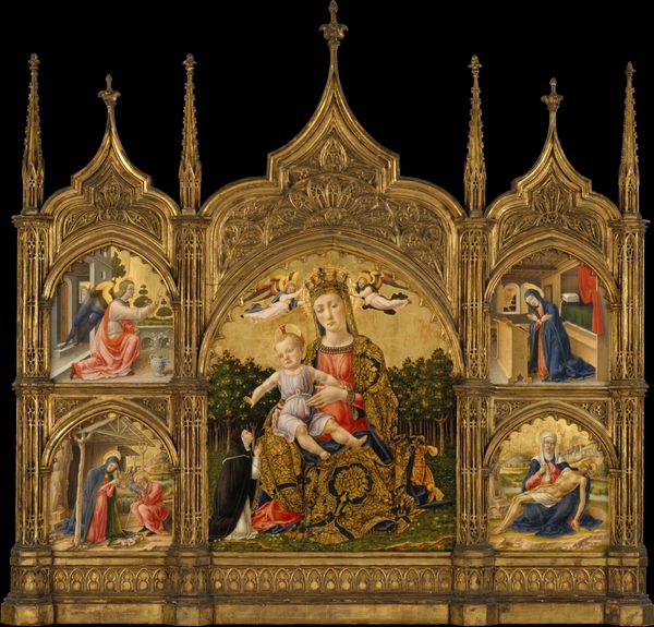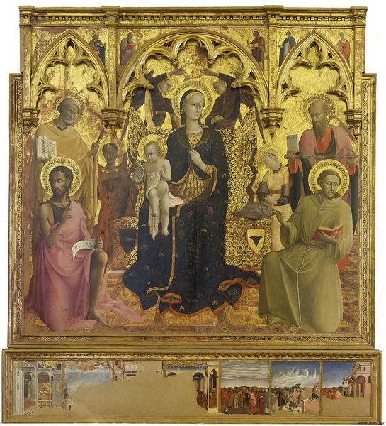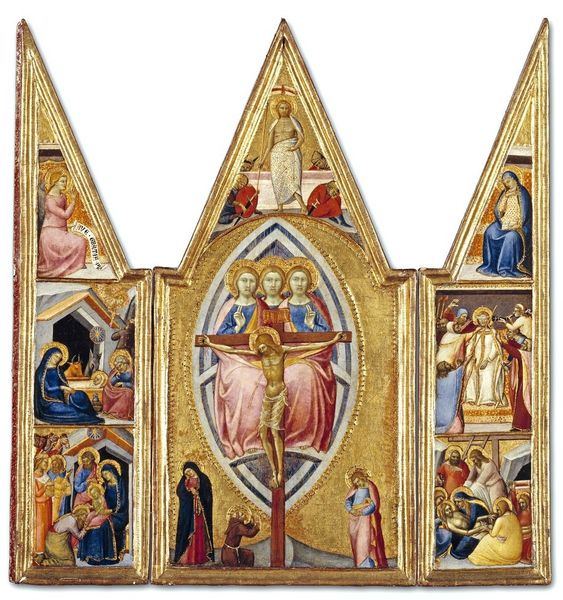 This Triptych of the Madonna with Child, Crucifixion, four saints and the Annunciation to Mary was painted by Cristoforo di Bindoccio in Siena, Italy, most likely in the late 14th century. It is a work deeply embedded in the religious culture of its time. The triptych format, with its folding panels, makes it an object for personal devotion, a sort of portable altarpiece. The central panel portrays the Madonna and Child surrounded by saints, while the side panels depict the Crucifixion and the Annunciation. These scenes, rendered in rich colors and gilded backgrounds, speak to a society steeped in religious symbolism. But the image also reflects institutional histories. Painted in Siena, a city-state with its own unique artistic traditions and its own complex relationship to the church. It would be useful to examine parish records, confraternity documents and other archival material for any evidence of the kind of patron that might have commissioned such a work. The work reminds us that the meaning of art is contingent on a whole host of historical conditions.