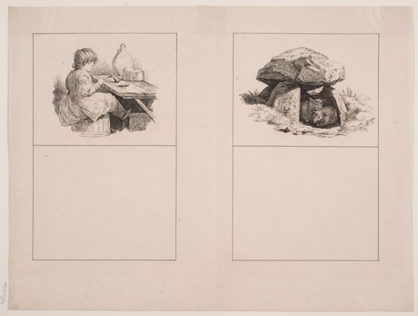 Curator: This lithograph by Adolph Kittendorff, dating back to 1845, presents us with two vignettes side-by-side: "Svinet og anden; Lækatten," or "The Pig and the Duck; The Weasel". It's part of the Statens Museum for Kunst's collection. Editor: It strikes me immediately with its starkness. The realism, or perhaps the *attempt* at realism, feels somewhat crude. Look at how different the textures are: The pig is rough, almost comical, while the weasel seems so still, so pristine in contrast. Curator: Indeed. Considering Kittendorff's practice, we see that the means of lithographic production enabled a wider circulation of these images to a broad public. Such prints played a critical role in shaping visual culture and were central to national identity and discussions around land and agriculture in Denmark during the mid-19th century. Editor: Right. It’s a comment on Denmark's relationship with nature and its perception during that era. Think about the pig—likely a farm animal—existing in the same print as a wild animal. Does this proximity invite a societal critique on domestication, our interaction with wildness? Curator: Perhaps. And what's crucial here is to note how the act of printmaking makes these images reproducible. That fact alone creates accessibility that sculpture or painting could not. Editor: Certainly. The accessibility implies a reach that goes beyond the elite and enters domestic spaces more easily through reproduced media such as this, wouldn’t you say? The public is now privy to the images, even if that image reflects back a society and system which may still be beyond their access. Curator: I agree. What seems initially to be just illustrations are, upon closer look, windows into a specific era’s complicated interplay between humans, animals, and the systems, technologies, and materials that reproduce how they view them. Editor: So even in these simple, almost humble lithographs, there's this dialogue, or perhaps more like a negotiation between production and representation within society and power. It's fascinating.