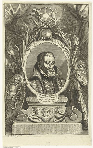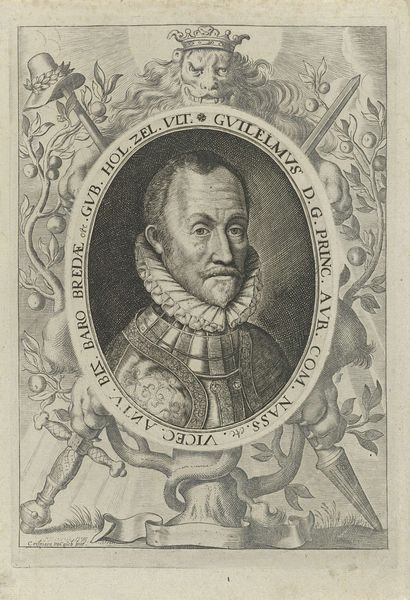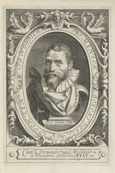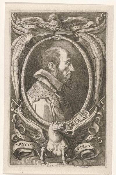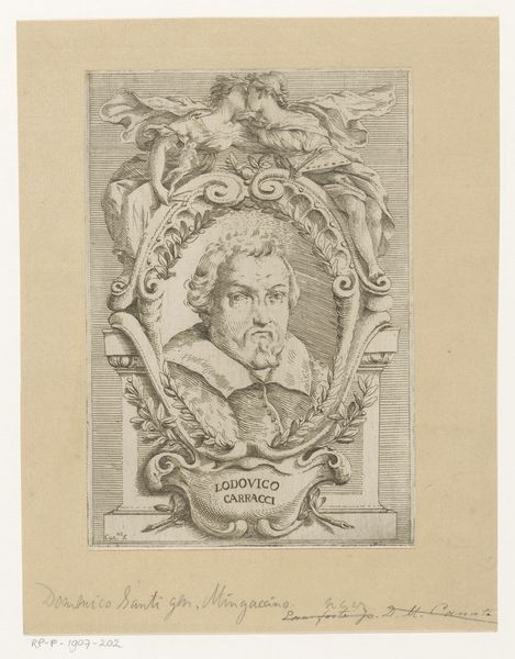 Curator: At first glance, the meticulous detail of the lines composing this image evoke a mood of introspection. The tight composition, coupled with the sitter's piercing gaze, hints at a contemplative, perhaps even melancholy, disposition. Editor: This engraving, titled "Portrait of the Artist Federico Barocci", hails from the 18th century and was created by Filippo de Grado. What intrigues me are the ways such images solidified artists’ reputations and shaped perceptions across generations. Curator: Absolutely. Barocci is presented here not merely as a likeness, but as an emblem of artistic achievement. Note the laurel wreath—an age-old symbol of victory and excellence, framing his face and suggesting an earned reputation. Editor: It's fascinating how the lower portion is segmented away, isn’t it? With the depiction of a lone woman sitting and reading a book adjacent to an eccentric detail of a single fowl and a caged item, like something one might keep water in, perhaps hinting towards spiritual or creative processes in isolation. Curator: Precisely! Consider also the deliberate act of engraving as a medium; each line etched painstakingly mirrors the artist's dedication and enduring legacy. And in an effort to further enhance its effect on the viewer, the symbols may attempt to speak for what lies within. Editor: I wonder about the accessibility of these images in their own time. Who consumed them and what narratives did they reinforce about artistic genius and its inherent place in society? And, did Barocci himself collaborate to further propagate that narrative? Curator: Such considerations take us beyond the mere aesthetics of the image. These images become social signifiers that both reflect and shape cultural values. And in some cultures, birds can act as symbols, in a psychoanalytic sense. Editor: Indeed. It seems images such as this provided not only glimpses into an individual's face but also illuminated the socio-political dynamics and the ways in which artistic merit was defined, validated, and circulated throughout history. Thank you for those brilliant insights. Curator: And to you! I think considering all of the aforementioned contexts really makes the symbols really come alive in one's minds' eye.
