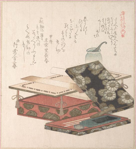 Editor: This woodblock print, "Framed Painting, Small Stand with a Wine Cup and a Dish with a Fish," dates to the 19th century and was created by Ryūryūkyo Shinsai. The fish on the plate, especially, seems a bit... unsettling. I wonder what's going on here. What do you see in this piece, from a historical perspective? Curator: It’s fascinating, isn't it? On the surface, this still life feels like a collection of auspicious objects rendered in the ukiyo-e style. But I think, from a cultural and political standpoint, it could be more complex. Fish, of course, often symbolized wealth and abundance. But consider its placement – dead, on a dish, displayed almost like a trophy. Editor: I see what you mean. It’s not exactly appetizing, is it? Curator: Exactly! Could this be a commentary on excess, perhaps on the unequal distribution of resources? Consider the political landscape of 19th-century Japan; growing class divisions were starting to emerge as modernization accelerated. How might Shinsai be subtly critiquing these disparities through this image? Notice the framing too – is it highlighting, celebrating or confining these objects? Editor: I hadn't considered that it could be social commentary, rather than simply an aesthetic arrangement. It’s interesting to think about how even a seemingly simple still life can reflect the political anxieties of the time. I now appreciate this artwork's narrative layers. Curator: Precisely. Ukiyo-e were not just pretty pictures; they were often mirrors reflecting, or sometimes distorting, social realities and class anxieties within Japan. Always remember, even beauty can carry a critical message!
