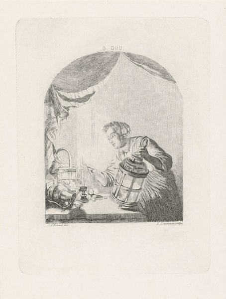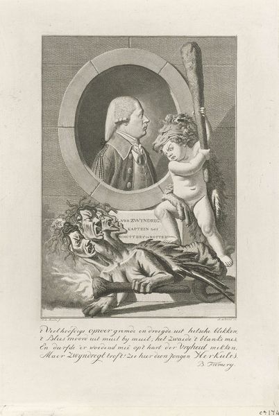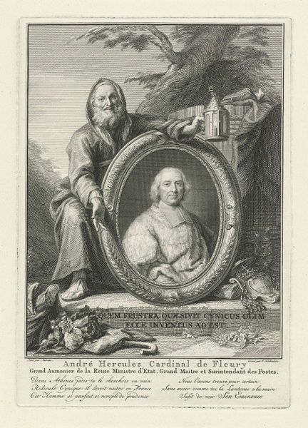 Jacob Houbraken produced this engraving, "Diogenes bij een portret van André-Hercule de Fleury", sometime in the 18th century. It depicts the Ancient Greek philosopher Diogenes holding a portrait of the French cardinal and statesman, André-Hercule de Fleury. Diogenes, known for his ascetic lifestyle and critique of social values, seems an unlikely companion to a portrait of a high-ranking member of the French court. The image creates meaning through this stark contrast, inviting reflection on the nature of power, wealth, and philosophical ideals. Made in the Netherlands, this engraving reflects the Dutch Republic's interest in both classical philosophy and contemporary European politics. The presence of Diogenes challenges the norms of the time, questioning the institutions of power. Understanding this engraving requires considering the social context of 18th-century Europe, delving into biographical accounts of both figures, and exploring the philosophical ideas that underpin the image. Art history helps reveal art's complex relationship to its social and institutional context.