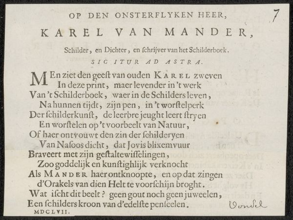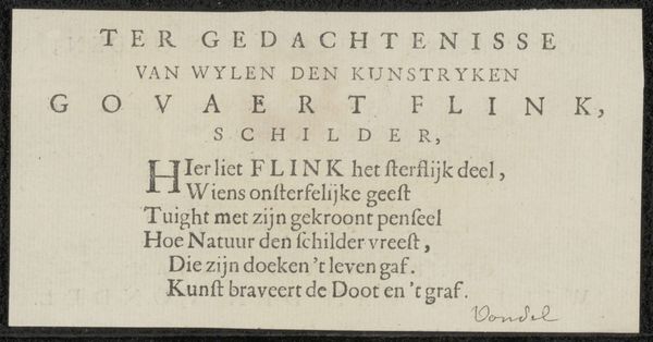 This printed poem, 'Gedicht op Rijcklof van Goens', was created by Joost van den Vondel, likely in the mid-17th century. As a printed work, it belongs to a world of mechanical reproduction, where text and images could be disseminated widely, becoming available to the public on an unprecedented scale. The poem, dedicated to Rijcklof van Goens, who served as Governor-General of the Dutch East Indies, speaks to a specific historical and political context: the operations of the Dutch East India Company. It celebrates a figure deeply involved in colonial administration. Consider the labor involved in the production of the artwork. The making of the paper, the creation of the printing press, the typesetting of the letters, and the actual printing process. Looking at this seemingly simple piece of paper, we can reflect on a complex web of social, economic, and political relationships that shaped its production and dissemination.
