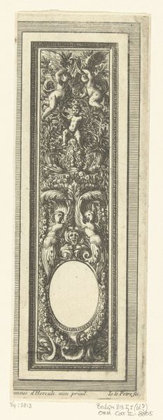 Curator: Let's discuss this striking 1657 engraving, "Paneel met twee engelen die schild vasthouden", which translates to "Panel with two angels holding a shield," attributed to Jean Lepautre and currently held at the Rijksmuseum. Editor: My initial response is drawn to its elegant and ornamental features, showcasing dynamic figures within a structured frame. It appears as a highly stylized design, perfectly capturing the Baroque spirit. Curator: Indeed. Consider how Lepautre, through figuration, evokes classical imagery in service of the aristocracy. Notice the central figures - angelic forms engaged in holding what appears to be an empty shield. Their bodies convey dynamic movement and seem suspended as though frozen mid-dance. This gesture is inherently tied to the allegorical language used for power in that period. Editor: The meticulous detailing highlights the artist's mastery. The use of line—particularly its density and variation—defines form, creates shadow, and imbues texture, generating depth. I'm particularly interested in how Lepautre’s controlled mark-making renders those billowing garments with such finesse. Curator: Observe how the imagery and ornamental excess serves more than surface decoration. The image hints at ideals tied with the era. The female figure prominently featured among winged cherubs draws upon our subconscious association and memories with the figure, to underscore narratives related to triumph, nobility, and legitimacy. It could represent an almost psychological need by institutions of power to claim authority, in that time period. Editor: Precisely. But looking at this work from the point of view of art’s composition, the symmetry that anchors it, allows the gaze to flow and remain centered within the panel, without drifting towards the edges. Curator: Looking deeper, the very act of displaying emblems of power suggests not just confidence, but perhaps also anxiety about social stability. The Baroque embraced such dramatic imagery, because society yearned for order. Editor: I find it interesting how this carefully crafted arrangement reflects cultural anxieties, expressed through highly decorative design. Curator: So, while seemingly an image glorifying nobility, it implicitly acknowledges its vulnerability and the psychological hold such displays needed to exert. Editor: Analyzing Lepautre's panel reveals his meticulous artistry and how structure supports narrative, shaping cultural ideals into tangible forms.
