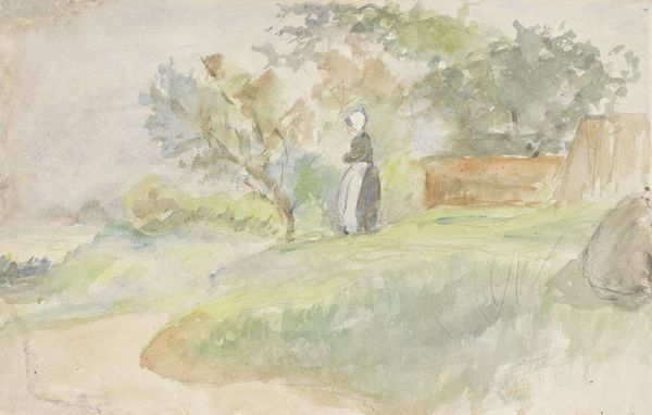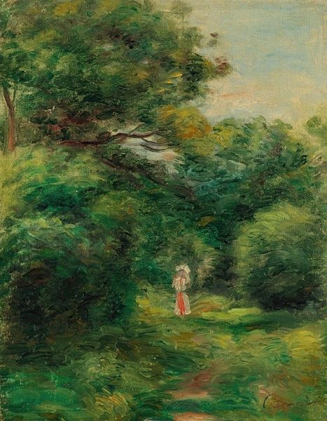 Editor: Here we have Henri Matisse's *Petit paysage du midi*, an oil painting that embodies the Fauvist style. There's a captivating lightness to it; the figures seem almost secondary to the wash of color creating the landscape. What are your thoughts on how the cultural context influenced the simplicity in the composition? Curator: That's a keen observation. The "simplicity," as you call it, isn't merely aesthetic; it's a reflection of the Fauvist movement's revolt against academic traditions dominating the art world. Matisse and his contemporaries aimed to liberate color and form from their descriptive functions. The historical backdrop of burgeoning industrialization and societal shifts perhaps made artists seek refuge in primal expression, using landscapes as a canvas for raw emotion. The museum space itself shapes our interpretation; does its current location within a larger exhibit about "escapism" influence how we perceive it? Editor: Absolutely. Thinking about escapism, the colors definitely amplify that sensation. They're vibrant but somewhat muted, offering a dreamy atmosphere. Are there political undertones associated with this departure from realism, as some critics have suggested? Curator: Precisely. Considering the socio-political climate of early 20th century Europe, marked by increasing anxieties, this overt embrace of subjective experience in art became an implicit statement. The avant-garde movements challenged the establishment, asserting individual agency through creative freedom. Were they outright protesting? Maybe not explicitly. But by dismantling conventional artistic norms, they certainly paved the way for questioning broader structures of authority. Editor: That's fascinating. I never considered the rebellious aspects intertwined with something that visually seems serene. Now, what have you found most enlightening about this piece? Curator: I've been prompted to remember the active role that art plays in reflecting societal unease and political challenges of its period, albeit often encoded in symbolic and stylistic choices, beyond immediate aesthetic impressions. Editor: And I learned about the layers of meaning concealed beneath apparent simplicity; every color choice and composition has intention and implications.