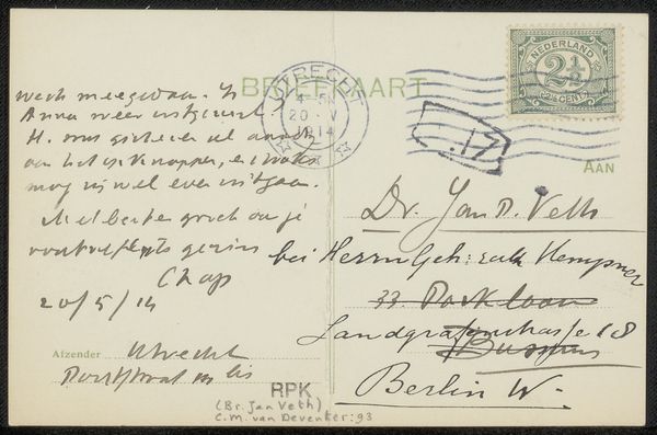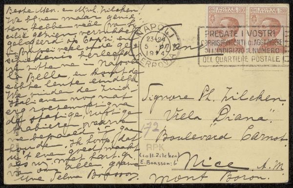 Curator: Our attention is drawn to "Prentbriefkaart aan Philip Zilcken," a postcard likely dating back to 1923. Editor: Immediately, I'm struck by the intimacy. The faint ink and dense handwriting convey a personal touch. Curator: Precisely! Created in ink, this work provides a direct link to a specific time. Given Vittorio Pica as the letter sender's name on the reverse, this suggests a fascinating dialogue within the art world of the early 20th century. Zilcken, a contemporary and peer, presumably. Editor: Absolutely. You're right, though, to remind me. Pica was a vocal and at times a controversial art critic—how does his criticism reflect this correspondence, I wonder? What were their overlapping values, biases? Also, looking closely at the hand-drawn type and what is legible of the text, a place called Nice, for instance— what insight can we glean about their artistic or perhaps personal relationship? Curator: The very format is intriguing, isn't it? A postcard isn't just a quick greeting, it can be an invitation to reflect or, indeed, to initiate deeper consideration in the exchange of ideas, particularly given their connection to the larger Post-Impressionist art scene. One wonders what the front side of the card depicts? The correspondence could be related directly to it, no? Editor: Postcards inherently make the private public. Who would have seen it beyond Zilcken? Perhaps this gives agency back to the recipient, too? It is, on the other hand, inherently voyeuristic in a museum. This is just an incredible find that has many cultural and social layers, that makes one ponder the meaning of the piece! Curator: Indeed. Every word, every line—they all open up historical perspectives on artists communicating within their contemporary context. Editor: So true—It challenges the museum visitor to rethink history.
