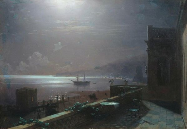Editor: This painting, "Ruin by the Sea," by Arnold Böcklin, painted in 1881, certainly has a melancholic mood. Looking at how the oil paint renders the crumbling architecture, I'm curious – what is the significance of this ruin in your eyes? Curator: Böcklin presents us with the endpoint of architectural creation; notice the way the paint itself mimics the degradation of the stone. The production, use and eventual abandonment of building materials signifies cycles of civilization and their relationship to natural forces like the sea. Are we invited to mourn what was lost, or to question the value placed on permanence itself? Editor: So you're saying the very substance of the painting contributes to its message? It's not just the *image* of a ruin, but the *materials* *become* the ruin? Curator: Exactly! Böcklin manipulates our perception, dissolving the hierarchy between high art and 'low' materiality. Consider how traditional historical painting focused on triumphant scenes, reinforcing power structures. Here, labor and construction meet decay; Böcklin forces a confrontation with material reality and questions what’s left behind. Does seeing the work through a lens of material processes shift its meaning for you? Editor: It certainly does. I was initially drawn to the Romanticism of the piece, the grand ruin and dramatic light. Now, thinking about the effort it took to create these structures, and then the labour needed to *represent* its downfall in paint... it highlights the futility of so much human endeavor. Curator: And in the context of the 19th century, marked by industrial expansion and material excess, Böcklin perhaps offers a cautionary tale on the impermanence of our material world. Editor: I appreciate how analyzing the materials used, and the way they're handled, provides such a fresh perspective, especially given the historical context. Curator: Indeed, and reflecting on this piece allows us to consider the long relationship between creation, consumption and ruin.