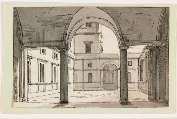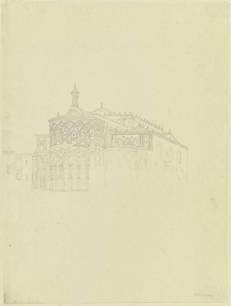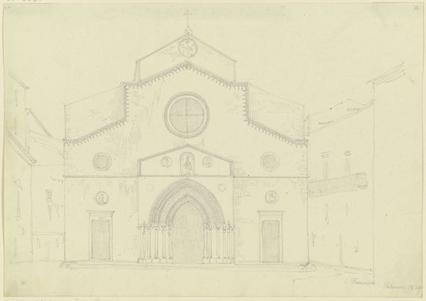 Editor: So, this is Friedrich Maximilian Hessemer's "St Frediano in Lucca," an etching and pencil drawing from 1830. It's a strikingly straightforward depiction of the church, almost like an architectural blueprint. What jumps out at you when you look at this piece? Curator: It reminds me of quiet mornings in Italy, sketching under the Tuscan sun with nothing but time and a few trusty pencils. But beyond the peacefulness, I see Hessemer wrestling with capturing the monumental nature of architecture. See how he uses delicate lines and precise angles? Almost as if he’s mapping out the spirit of the place rather than just its physical form. It’s neoclassicism at its finest - cool, collected, and concerned with order, yet never losing a spark of humanity. Do you find it cold or captivating? Editor: I wouldn't say it's cold exactly, but there's a definite lack of...life. No people, no real shadows. Does that strip away from its emotional impact? Curator: Perhaps, but absence, darling Editor, is a presence of its own. Think of it as Hessemer handing you a stage, empty except for this architectural protagonist. What stories bloom in your imagination when you fill in the gaps? Is it a bustling market day or a silent afternoon of contemplation? Editor: I guess I was so focused on what *wasn't* there, that I missed the opportunity to bring my own story to it. I like that, actually. Thanks! Curator: Art, like life, is what we make of it, right? It seems Herr Hessemer has granted us quite the collaborative adventure!