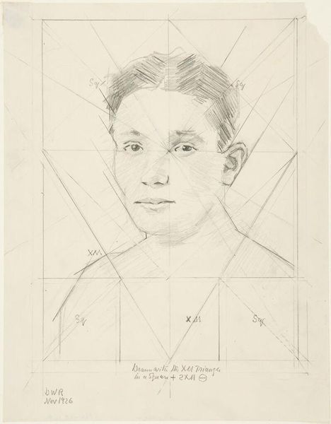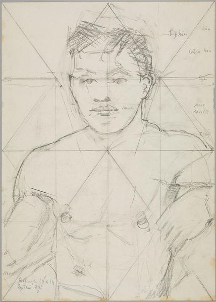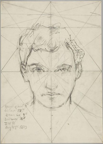 Editor: So, this is "Male Head" by Denman Waldo Ross, a pencil drawing. It's interesting how the face is overlaid with a geometric grid. What strikes you most about this sketch? Curator: It’s like the artist is trying to find the ideal proportions, almost dissecting beauty itself. The grid isn’t cold though, is it? Instead, it feels like a roadmap to understanding, a tender exploration. Like the artist is searching for something true. Editor: I see what you mean. It's not just technical; there's a vulnerability in the process. Curator: Exactly! And isn't it wonderful to witness that intimate search? It makes me wonder about the face itself, the story it holds within the lines. Editor: Definitely gives me something to think about. Thanks! Curator: My pleasure. Art is a mirror reflecting both the artist and ourselves, isn't it?