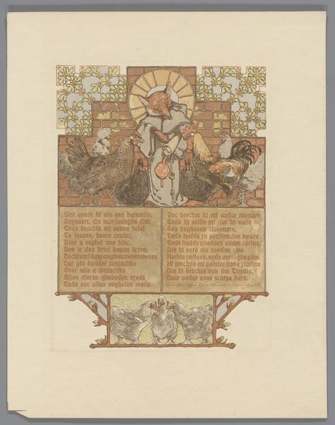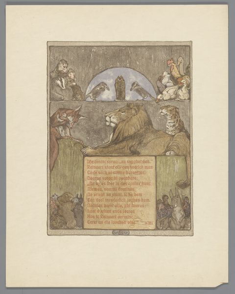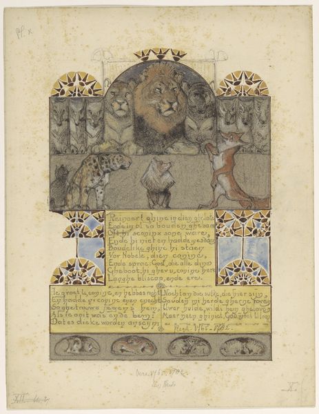 Editor: This piece, titled "Sampler," is by Elizabeth Valentine, dating from around 1935 to 1942. It appears to be a mixed-media work combining drawing and textile elements. There's an interesting tension between the almost naive folk art style and the intricate detail. How would you interpret its composition, particularly the layered scenes? Curator: From a formalist perspective, the "Sampler" offers a complex interplay of visual planes. Observe how Valentine employs distinct registers to separate the textual elements from the figurative scenes. Each section presents a different mode of representation, almost as independent studies brought together in a cohesive whole. Editor: I see what you mean. The alphabet and verse at the top act as a header, visually distinct from the narratives below. But what does it signify formally? Curator: It signifies the fundamental structure inherent within the artwork, the clear visual boundaries, acting as semiotic markers. The contrasting textures and medium enhance the deliberate visual compartmentalization, thus providing an intrinsic reading experience which is then visually and conceptually complete within itself. Are you also noting how the floral border emphasizes the self-contained quality of this "Sampler?" Editor: Yes, it's like a frame within a frame, drawing attention to the internal relationships between the elements. The drawing combined with needlework emphasizes that handmade construction. The black ground further sets off and highlights this effect. The relationship of color is very simple: green, brown, white and black and some slight variants are very clearly and simply composed to build a series of interesting scenes. Curator: Precisely. It invites closer inspection and a formal reading as a piece. The overall impact is thus very well harmonized, without relying upon contextual clues. The relationships between its material construction and aesthetic elements are quite considered, providing the viewer with great nuance for investigation. Editor: That gives me a fresh outlook! Curator: It is the beauty of formalism to view an art's essence directly from its materials.