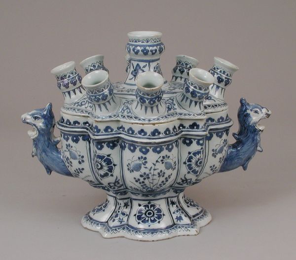 Editor: Here we have a wine cistern, a ceramic sculpture made in the late 17th or early 18th century. The intense cobalt blue is so striking, and I'm immediately drawn to the sculptural figures serving as handles. What do you see when you look at this piece? Curator: I’m struck by the interplay of form and surface. Notice how the piece is structured in distinct registers: the base with its repeating arched motif, the middle section filled with dense floral patterns, and the upper rim adorned with stylized figures. It's a feast for the eyes in terms of layering. Do you perceive how the use of color enhances this structure? Editor: Yes, the contrasting dark blue against the white floral designs really makes each section pop! The use of perspective and depth is really interesting, especially within the intricate patterns. How does the shape inform your interpretation? Curator: The ovoid form itself functions as a canvas, permitting an elaborate exploration of surface decoration. Note that it isn’t merely a container. Its essence lies in the tension created between the structural contours and the almost unrestrained ornamentation. It serves as a study in Baroque exuberance. Editor: That makes sense! So the functionality almost takes a backseat to the aesthetics? I find it interesting how the purely decorative elements create so much meaning on their own. Curator: Precisely. The value resides in the aesthetic experience. It allows us to focus on its intricate and symbolic layering without being encumbered by its functional role. Editor: It's amazing how focusing on just the structure and visuals unlocks a deeper appreciation. I wouldn't have thought of it that way initially. Curator: Indeed. Analyzing its components and their relationships provides new perspectives and richer understandings of its purpose and value.
