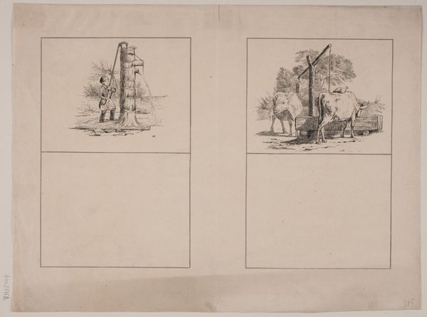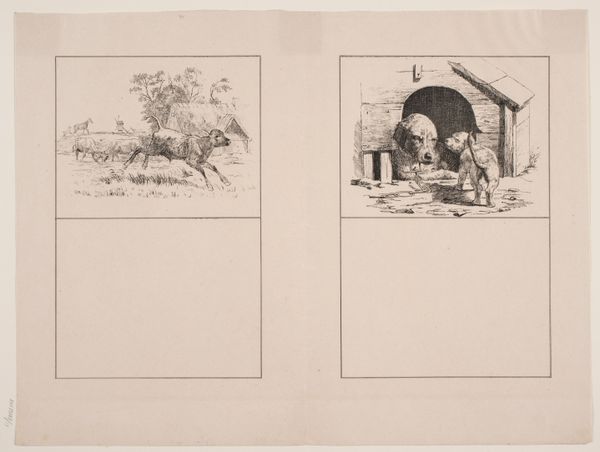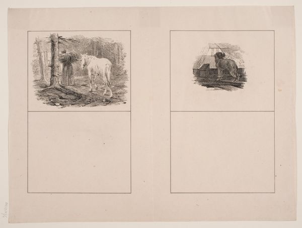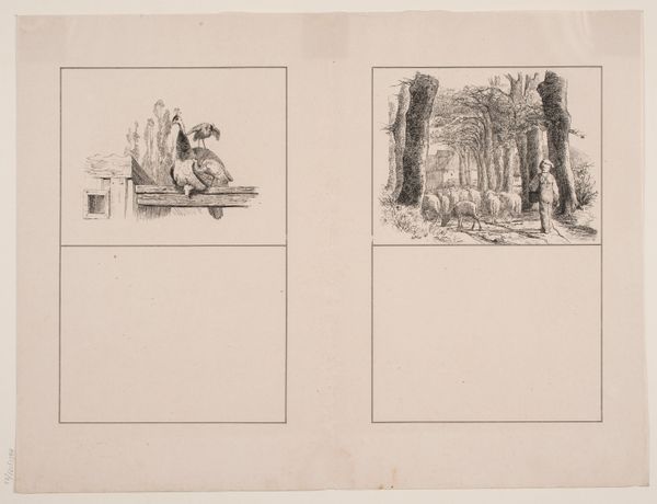 Adolph Kittendorff created this image, "Fiolen; Aftenstunden," using an engraving technique. Notice how Kittendorff divides the image into two distinct scenes, each framed within its own rectangle. On the left, we see a close-up of a violet, rendered with meticulous detail. The lines create texture, giving the leaves a palpable sense of volume and presence. To the right, a contrasting scene unfolds: figures stand by a fence, their forms less sharply defined, almost blending with the landscape. Kittendorff plays with figure-ground relationships, creating a tension between the intimate botanical study and the broader human scene. Consider how these juxtaposed scenes might engage with semiotic theory. Is Kittendorff inviting us to reflect on the natural versus the social? By framing these images in such a way, he emphasizes their constructed nature. The artwork resists a singular reading, instead fostering an ongoing dialogue between the viewer and the work.