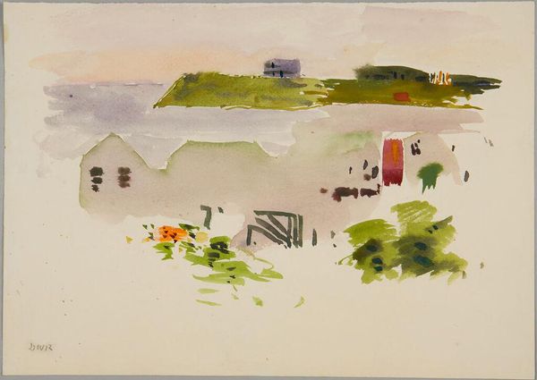 Curator: Here we have a small watercolor titled "Landscape" by Denman Waldo Ross, part of the Harvard Art Museums collection. Editor: It's remarkably serene, isn't it? The muted palette evokes a palpable sense of quietude. Curator: Ross was deeply invested in color theory; the interplay of tones here, especially the ochres and pale blues, creates a sophisticated, harmonious visual field. Editor: The architecture almost feels secondary, perhaps symbolic of human presence in a broader natural context. The buildings seem softened, absorbed. Curator: Precisely. Note how the forms are simplified, almost abstracted. It is less about depiction and more about the formal arrangement of shapes and values. Editor: There's a subtle melancholic quality to the piece, maybe related to the unadorned trees or the lonely stream in the foreground. Curator: I find the composition itself quite masterful. The placement of the structures and the negative space work together to create a balanced whole. Editor: A balance that nonetheless invites reflection on the temporality of structures, human and natural. Curator: Indeed, a small but potent example of Ross's aesthetic sensibilities. Editor: Yes, a fleeting moment captured with an understated symbolic weight.