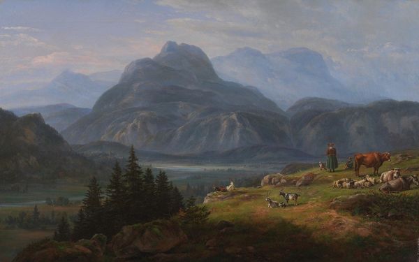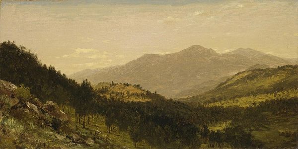 Editor: This is "The Artist Sketching at Mount Desert, Maine," an oil on canvas painted by Sanford Robinson Gifford around 1864 or 1865. The sweeping landscape is breathtaking, but what really strikes me is the artist himself, perched on that cliff. What do you see in this piece, considering its historical context? Curator: Well, for me, it speaks volumes about the evolving role of the artist and the perception of landscape during the mid-19th century. Think about the Hudson River School, of which Gifford was a prominent member. They weren't just painting pretty pictures; they were shaping a national identity. The artist *in* the landscape becomes a crucial element. He's not just an observer; he's mediating our relationship with nature. Editor: That makes sense. He’s like a stand-in for the viewer, almost inviting us to contemplate the vastness. Is there a political dimension here? Curator: Absolutely. Consider the Civil War raging during the years this was painted. Landscape painting offered an escape, a visual articulation of the American promise, particularly during times of great upheaval. Think about what the untamed American landscape meant at a time when the nation's identity was in flux. Who controlled this land, and for what purposes? Gifford’s idealized rendering certainly obscures more complex realities of westward expansion and dispossession. Editor: So, it’s both an escape and a subtle commentary, or perhaps even a reinforcement, of certain national myths. Curator: Precisely. The "naturalness" of the scene obscures those political considerations. How do museums like ours frame paintings like these today, perpetuating or challenging earlier interpretations? It is important to critically consider such questions. Editor: It's fascinating how a seemingly straightforward landscape can be so deeply layered with meaning. I’ll definitely look at these works differently now! Curator: It’s all about seeing beyond the surface. Considering the artist’s position within broader cultural narratives unlocks so much.