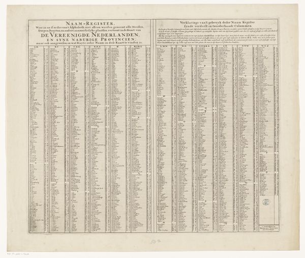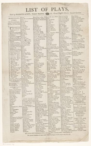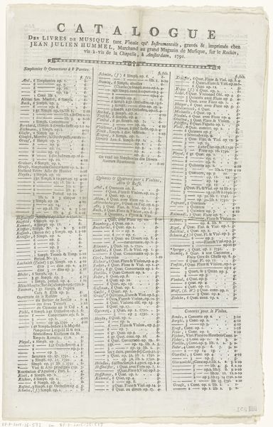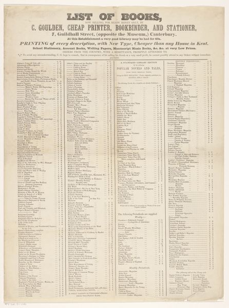 Curator: Well, hello there. This intriguing document, dating from 1866 to 1877, is titled “Fondslijst James Anderson.” It is held at the Rijksmuseum. It’s a print on paper showcasing the photographic work of James Anderson. Editor: Okay, immediately, I see just walls of text, carefully arranged... but my first instinct is to question the document’s very essence—is it even art? Or something else entirely, like historical cataloging or a price sheet? Curator: That's a brilliant entry point, really. This is indeed a finding list, meticulously compiled. It's a practical tool and promotional vehicle, itemizing the breadth of James Anderson’s photographic output. These were views he captured across Italy, Spain, and environs, as the header indicates, largely intended for Spithöver's Library. It demonstrates how photography served knowledge dissemination. Editor: So, function dictated form, right? Knowing that contextualizes it and, in my perspective, deepens its purpose as art. It’s less about aesthetic flourish, and more about cataloging life... literally a table of contents for a visual world at that time. Still... the details are practically unreadable. Is it meant to be poured over at length? Curator: I'm imagining some 19th-century scholar poring over it to order photos from afar... which underscores how different art dissemination was before digital technologies. Museums at this time period were centers for information, where a picture really was worth a thousand words, and one meticulously captured building more valuable than most could imagine. Editor: And there's something about the plainness, the matter-of-fact tone, that strips away any pretension. The photograph serves as the conduit for some deeper, historical understanding. You bring up museums, but even now in the 21st century, consider our social media feeds: in this format it still operates as this curated list of visual artifacts for review and analysis. Curator: Absolutely. Its austerity emphasizes accessibility and objectivity, at least as envisioned back then. Though the aesthetic is definitely something—a perfect artifact of information design from a century where data visualization had an entirely different visual language than now! Editor: A beautiful intersection between art, cataloging, and pure, historical document! Its stark simplicity really reframes the very purpose of art collection.