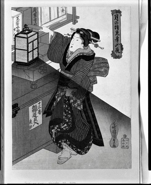 Curator: This woodblock print is titled "Woman Beside an Anchor with a Flounder," by Utagawa Kuniyoshi. It’s part of a series called "Five Pictures of Low Tide," and it's currently housed at the Harvard Art Museums. Editor: It's like a dream, all soft edges and muted tones, even though it's just black and white. The woman herself seems startled, caught between realities. Curator: Kuniyoshi was very savvy about the public's appetite for the bizarre, so he frequently played with folklore and ghost stories, using conventions like dramatic poses to heighten the tension. Editor: She's holding a flounder, right? And what is that behind her, some kind of...creature? But she also has a knife. Is she prey, or predator? I like the ambiguity. Curator: The fish and the anchor are symbols related to the sea, and the woman's attire suggests someone of higher status, perhaps on an unusual outing. Kuniyoshi was commenting on social boundaries, questioning traditional roles through these prints. Editor: So, it's not just a pretty picture; there's a whole world of social commentary tucked in there. Makes you see the image—and the woman—in a whole new light.
