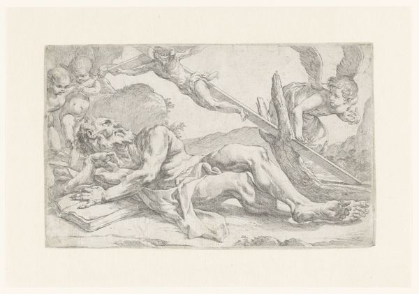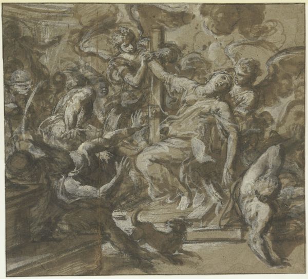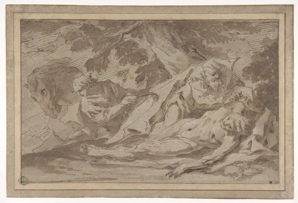 This drawing at the Städel Museum was made by Paolo Farinati, and it depicts nine nude men in a complex, intertwined composition using pen and brown ink. The artist has rendered the scene with dynamic lines and stark tonal contrasts, creating a dramatic and emotionally charged atmosphere. The figures are arranged in a dense, almost sculptural mass, with limbs and bodies overlapping to convey movement and strain. Farinati’s formal approach highlights the human form not just aesthetically but as a carrier of meaning. The muscularity and the contorted poses of the figures suggest a scene of labor or suffering. The use of hatching and cross-hatching to model the forms emphasizes the three-dimensionality of the figures and adds depth to the composition. The dark, shadowed areas contrast with the lighter, highlighted areas, creating a sense of depth and volume. Farinati's masterful handling of line and tone invites us to consider how the body can function as a site of both physical and emotional expression.