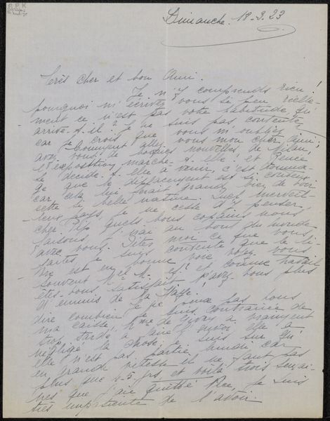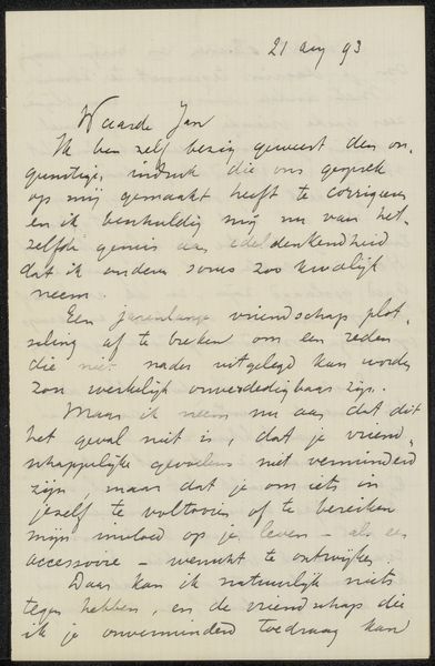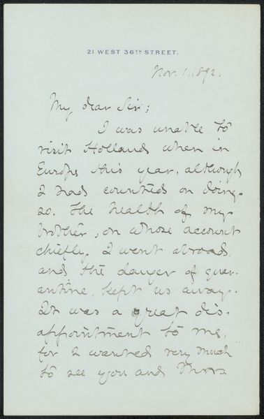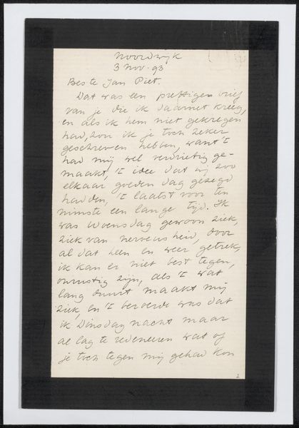 Curator: Here we have Hendrick Peter Godfried Quack's "Brief aan Jan Veth," thought to have been created sometime between 1911 and 1916. The artwork features ink on paper, displaying a striking example of hand-drawn type and calligraphy. Editor: Immediately, I’m drawn to the contrast—the stark black ink against the off-white paper. It feels quite intimate, a glimpse into a personal correspondence. There’s also a beautiful rhythm in the script, a sort of visual texture created by the density and spacing of the letters. Curator: Precisely. The choice of materials—the absorbency of the paper impacting the ink flow, the very act of handwriting instead of using a printing press—highlights the deliberate process of creation. Consider, too, the implied social relationship between Quack and Veth; this is communication shaped by individual effort and crafted specifically for the recipient. Editor: Absolutely. The letterform itself is quite expressive. Notice how certain strokes thicken and swell, adding emphasis and character. It almost transcends purely functional communication to become an art object. The materiality becomes meaning, wouldn't you say? Curator: Yes, and we also must consider the accessibility and the act of consumption in relation to its handwritten design. These nuances allow the writing to hold certain unique markers of the maker themselves. It invites an intimacy. Editor: Yes, it’s far more than just the literal message. The visual aesthetic itself—the deliberate composition, the flourishes, the very feel of the ink on the page – adds a layer of meaning. The paper acts almost like the skin to which this type of language manifests, almost as important as the linguistic purpose. Curator: Indeed. And examining the historical context is crucial. This was a time of immense social and political change. Something to consider is what class and educational context makes something like calligraphic language an option, let alone, skill for such people to enjoy in such intricate processes. Editor: A lovely convergence of form and feeling; analyzing the medium itself enriches my appreciation for the whole. Curator: A letter made as object and evidence; this adds immeasurable depths to its narrative.