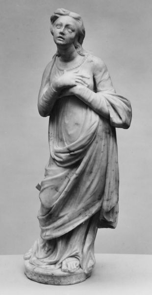 Curator: Georg Christian Freund completed this marble sculpture, titled "En lille pige, som plukker blomster" or "A Little Girl Picking Flowers," in 1848. It’s currently housed at the SMK, the National Gallery of Denmark. Editor: It strikes me as incredibly tender. The girl's downward gaze and gentle pose suggest a quiet intimacy with nature, almost reverential. Curator: Freund was a prominent figure in Danish Neoclassical sculpture. He often worked on public commissions, but also produced smaller, more intimate works like this one, catering to a burgeoning middle-class interest in sentimental themes. This work fits into a wider vogue for representing childhood. Editor: The symbolism seems so deliberate. Flowers often represent innocence and ephemeral beauty. She’s collecting them, almost attempting to hold on to a fleeting moment. Curator: Precisely. And consider the broader cultural context of the time. The mid-19th century saw a rise in Romantic ideals that intertwined with ideas about the importance of the domestic sphere and the role of women within it. A piece such as this played into the idea of women's moral purity, connecting women with nature. Editor: I see that. Also, look at her bare feet! That contributes to the air of vulnerable innocence that surrounds the figure, almost reminiscent of Psyche or other mythological figures of that time. It evokes purity but also accessibility. Curator: These works became incredibly popular through reproductions, especially plaster casts and smaller scale porcelain figurines, effectively shaping wider attitudes on femininity. It contributed to establishing and disseminating an idea of national identity, one where nature was linked to ideals of home and family. Editor: Understanding the artwork’s cultural resonance back then, and its artistic intention, gives one so much insight into why the statue looks the way it does and, possibly, why we're still drawn to it today. Thank you for adding to the appreciation of this beautiful work. Curator: It's my pleasure; this exercise only goes to show the lasting influence such pieces had.